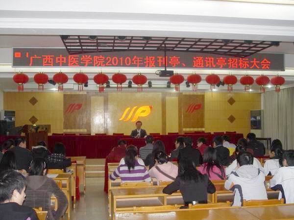 为鼓励同学自主创业,搭建创业平台,广西中医学院2010年报刊亭、通讯亭招标大会于3月17日晚在大学生俱乐部圆满落下帷幕,最终由来自07骨伤班级的钱志香同学标得通讯亭,由来自08中药班级的韦华荣同学标得报刊亭。