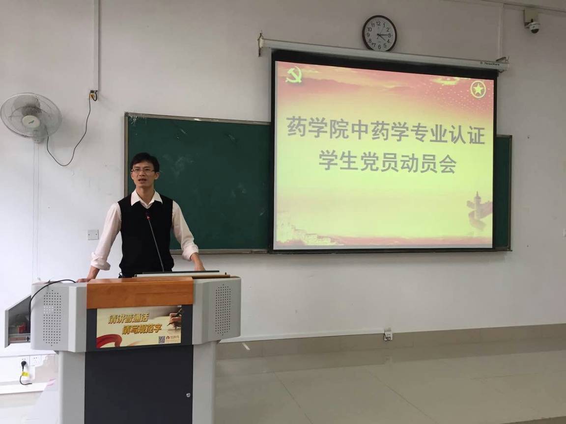 2017年4月18日下午,药学院在仙葫校区教学楼1-202,召开了中药学专业教学质量国家标准(简称“国标”)暨学生党员动员会,药学院党委副书记李豫萍、学生第一党支部书记凌勇威、学生第二党支部书记王金兰及2015级辅导员管海钦等90余名师生党员参加了培训与会议。