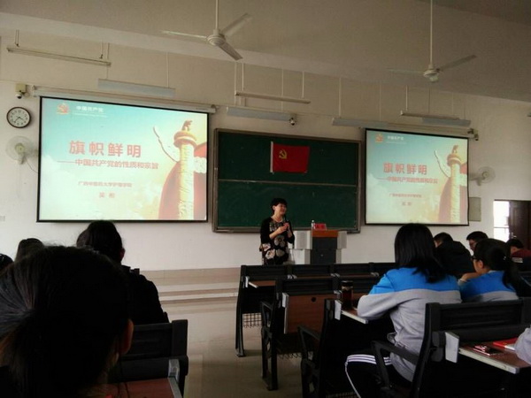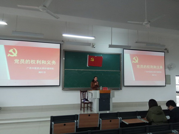 本期党课培训采取集中培训的方式,先后通过专题讲座方式进行。护理学院党委书记、院长吴彬、赛恩斯新医药学院党委副书记冼锦华、护理学院副院长马秋平、党委副书记韩叶芬、国际壮医医院党委副书记罗艺徽老师先后进行了精彩授课。授课内容包括了解共产主义精神价值意义、严肃处理党风、党纪、坚定共产主义信念、坚持履行党内义务以及依据中国共产党的中国梦与百年目标分析大学生如何实现自身价值、创建社会主义新道路、做社会主义合格接班人等主题。授课老师幽默风趣的语言以及精彩而独特的讲解,让同学们在轻松的氛围下提高了自己的思想觉悟,端正了自己的入党动机。