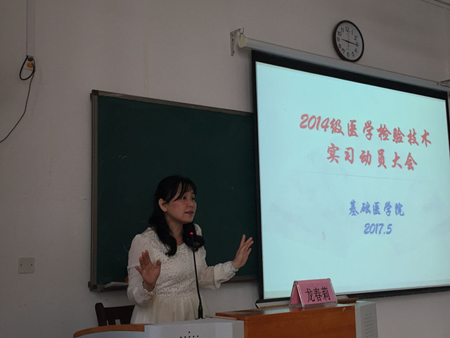 为确保基础医学院2014级医学检验技术专业毕业实习工作顺利进行,让同学们以积极正确的心态投入实习学习工作,2017年5月17日上午,基础医学院在仙葫校区1-204为2014级医学检验技术专业召开毕业前实习前动员大会。基础医学院党委副书记龙春莉老师为2014级医学检验技术专业共57名学生做了专题指导。大会由2014级医学检验技术班辅导员杨丽琴老师主持。动员会上,龙春莉副书记希望每一位同学珍惜此次实习机会,牢记“弘毅自强传承创新”的校训精神,在实习过程中展现星空彩票老版本下载学子的优秀品质和精神风貌。同时龙书记还提出几点要求:一是遵守制度,认真严谨。要求全体实习生明确实习目的和要求,严格遵守校纪院规,保质保量完成毕业实习任务,不断提高自身综合素质和医学实践能力。二是虚心求教、关爱同学。精湛的医疗技术是一个长期积淀的过程,医学生实习过程中一定要向实习带教老师多请教,多主动承担工作,不断提升自己的技术和工作能力。实习中多主动关心同学,和睦相处,互相互助。三是增强安全意识,安全为重。提醒同学们多注意实习操作过程中的安全防范,此外还要增强自身安全意识,如不要轻信陌生人的话,避免落入传销组织等。