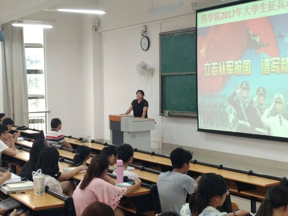 为了进一步落实学校征兵工作会议精神,做好大学生征兵入伍宣传工作,更好的号召药学院大学生应征入伍。6月28日下午5时,在仙葫校区教学楼1-309教室,药学院召开了2017年大学生征兵工作动员大会。出席会议的有武装保卫部代表,药学院领导、老师,退伍复学同学,学团骨干,学生党员等200余人。