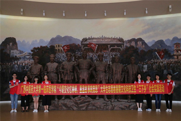 为深入贯彻习近平总书记系列重要讲话精神和治国理政新理念新思想新战略,落实习近平总书记青年工作思想,引导广大青年学生更加坚定跟党走中国特色社会主义道路的理想信念,感受生活变化和时代变迁,重温抗战故事及铭记党恩。2017年7月20日,第一临床医学院团委在广西革命纪念馆开展了大学生志愿者暑期文化科技卫生“三下乡”社会实践活动启动仪式。第一临床医学院团委副书记秦燕老师带队,团委李杭老师及实践队员共20余人参加了启动仪式。