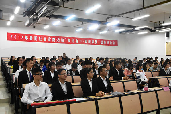 2017年暑期社会实践活动共有84支团队参加,总人数近5千人,实践地点布及广西、广东、四川、浙江等地区。他们来自不同的专业,不同的年级,通过医院实习、社会兼职调查、老年公寓临终关怀、贫困地区支教等形式,秉承中医“医以济世,术贵乎精”、“不忘初心,砥砺前行”的初衷,充实展现了我院学子的专业水平及综合工作能力。其中奇异果队、致远队、萤火虫队、特区队等11支团队表现特别突出,作为代表队汇报各自心得体会与收获,他们的发言获得在座同学的热烈掌声。
