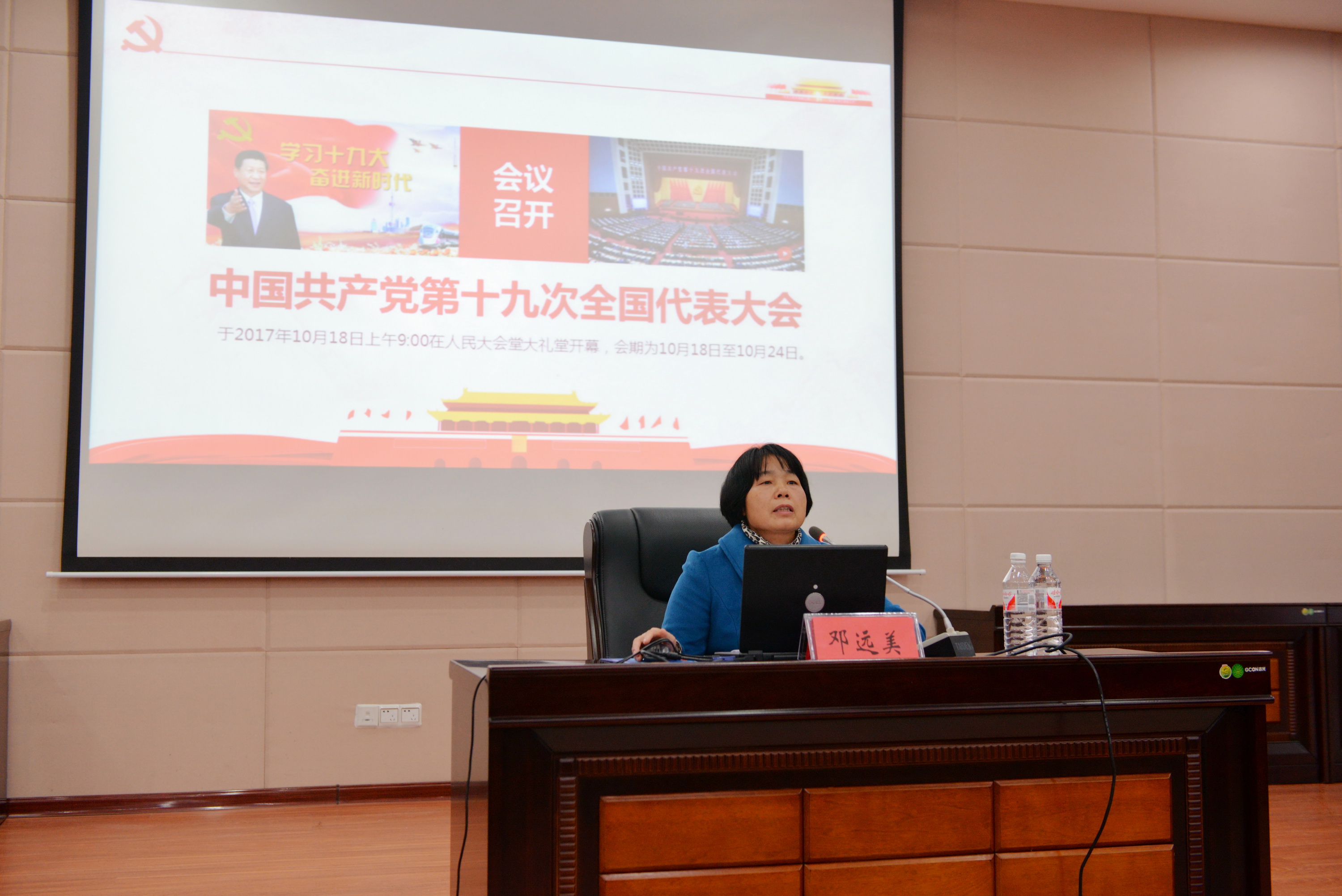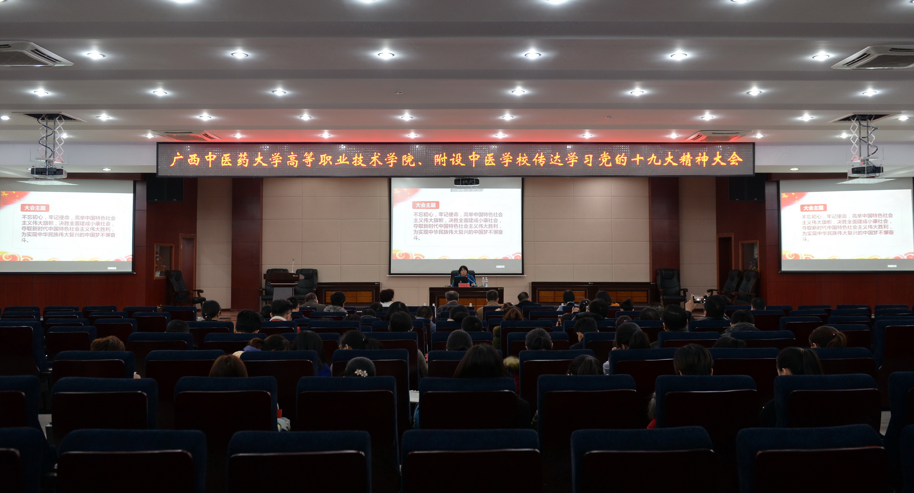 为了进一步深入学习贯彻党的十九大精神,高职院、附设中医学校党总支于11月22日下午在北湖校区多功能厅举行传达学习党的十九大精神大会,高职院、附设中医学校党总支书记邓远美传达党的十九大会议相关精神,高职院、附设中医学校党总支副书记、院(校)长刘竑清主持大会,全体党员干部参加大会。