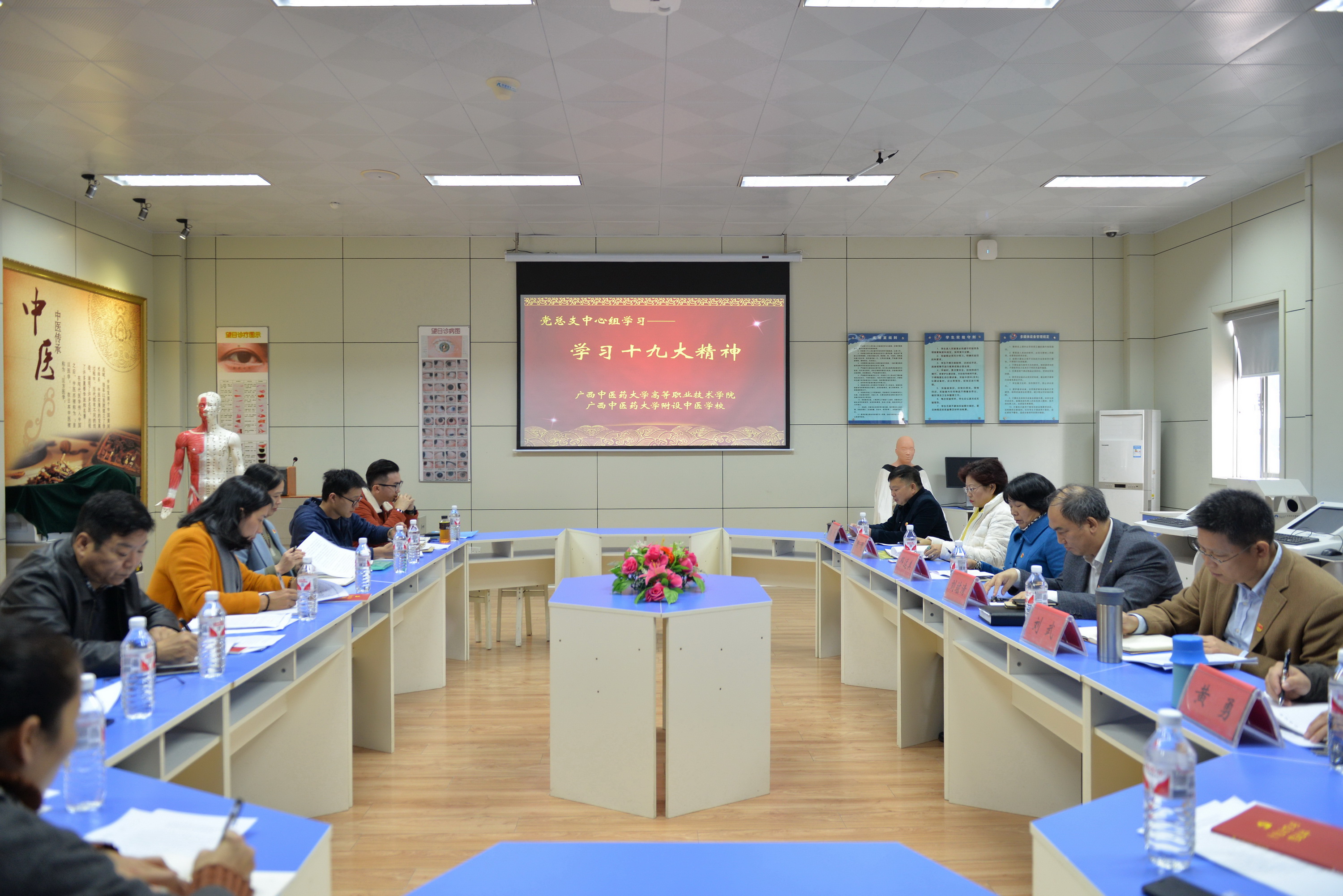 11月22日下午,高职院、附设中医学校党总支在北湖校区中诊实训室举行中心组学习十九大精神专题学习会。会议由党总支书记邓远美主持,党总支中心组成员参加学习。