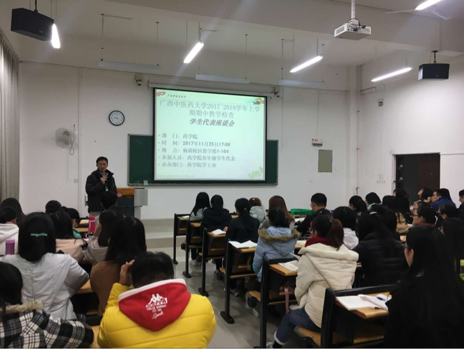 药学院深入贯彻十九大精神,进一步加强大学生思想政治教育工作,11月25日下午,在仙葫校区教学楼1-104召开本学期的学生代表座谈会。药学院学生工作办公室主任凌勇威、药学院辅导员孙慧玲及药学院各年级、专业的学生代表约60人出席本次会议。