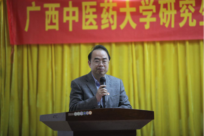 黄贵华为大赛致辞, 他提到深入贯彻落实党的十九大精神是每个人的使命,学习黄大年同志的先进事迹能更好地激励大家为推动中医药事业快速发展贡献出自己的一份力量。