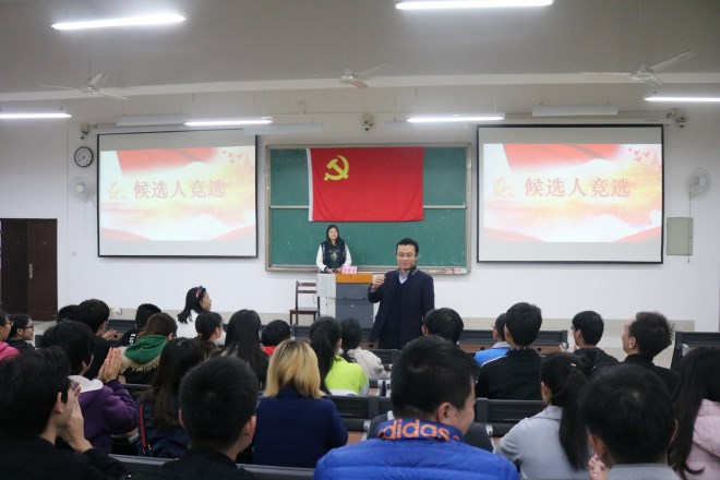 为强化基层组织凝聚力,提升基层组织战斗力,公管学院根据党章的规定,于12月8日晚在仙葫校区教学楼召开学工党支部委员换届大会,我院前学工党支部书记宋南,前学工党支部副书记鲁蕴律,以及2015级市场营销班主任陈荷老师、2016级应用心理学班主任庞邦君老师两位候选人及全体学生党员参加了此次会议。