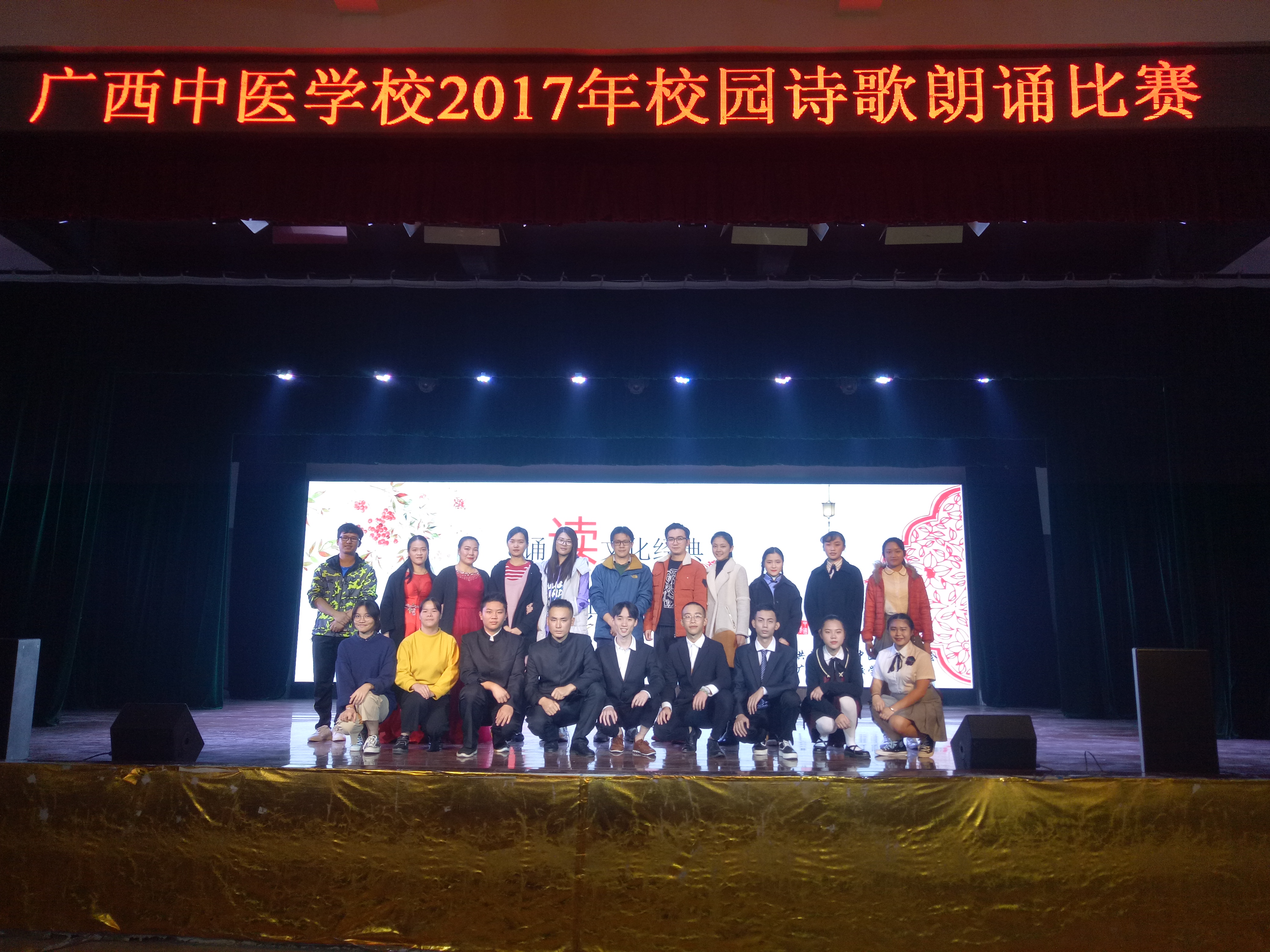 广西中医学校2017年校园诗歌朗诵比赛评委和选手合影