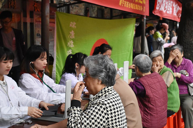 瑞康临床医学院“学雷锋”系列活动之南罐社区义诊 来源:瑞康临床医学院 作者:侯彬 日期:2018-03-19 点击数: 次 分享到: 3月17日,瑞康临床医学院组织团总支学生会全体成员走进南罐社区开展学雷锋义诊活动。一来到社区,同学们便积极投入到工作中。摆好摊位、热情宣教、与社区居民倾心交流、认真聆听居民诉求,尽自己能力为居民解答困惑,并给社区居民量血压、按摩艾灸,普及养生知识等。瑞康临床医学院团总支学生会将继续开展学雷锋系列服务活动,继续用实际行动发扬雷锋精神,共同践行社会主义核心价值观。义诊现场活动现场合影 打印正文 关闭本页