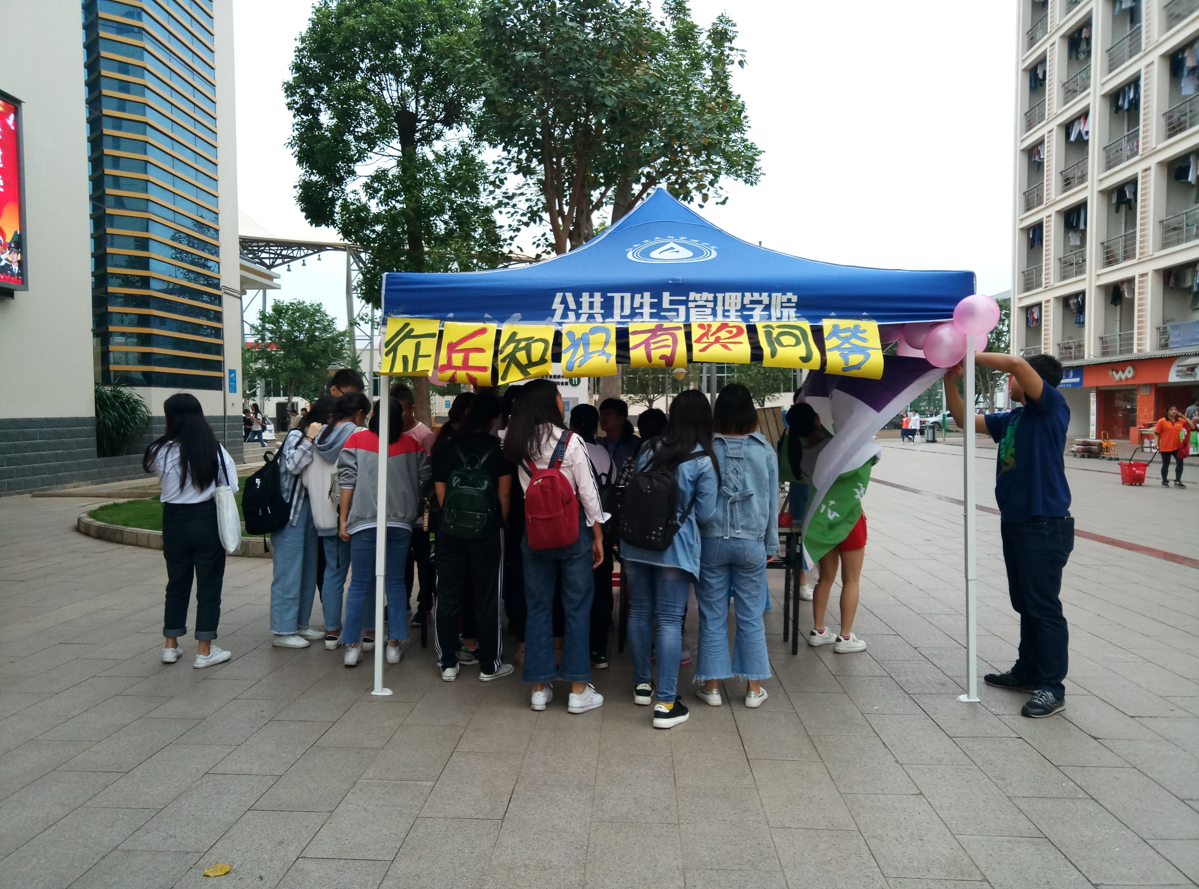 为了积极响应征兵的工作需要,做好今年征兵宣传工作,提高适龄青年参军入伍的积极性,公共卫生与管理学院开展了以“志向国防,勇抗大旗;携笔从戎,铁血筑梦”为主题的征兵系列宣传活动。4月25日至26日,学院团委学生会联合我院易班学生工作站在仙葫校区五合食堂门口开展以“志向国防,勇抗大旗;携笔从戎,铁血筑梦”征兵知识有奖问答活动。