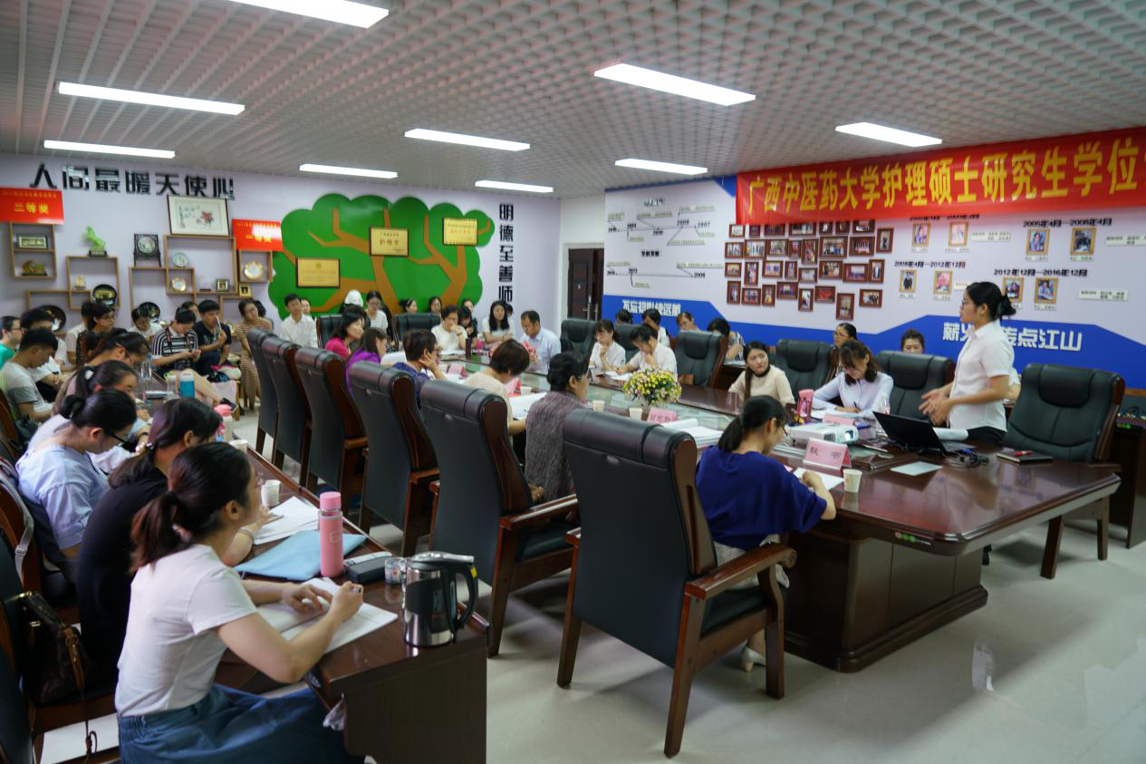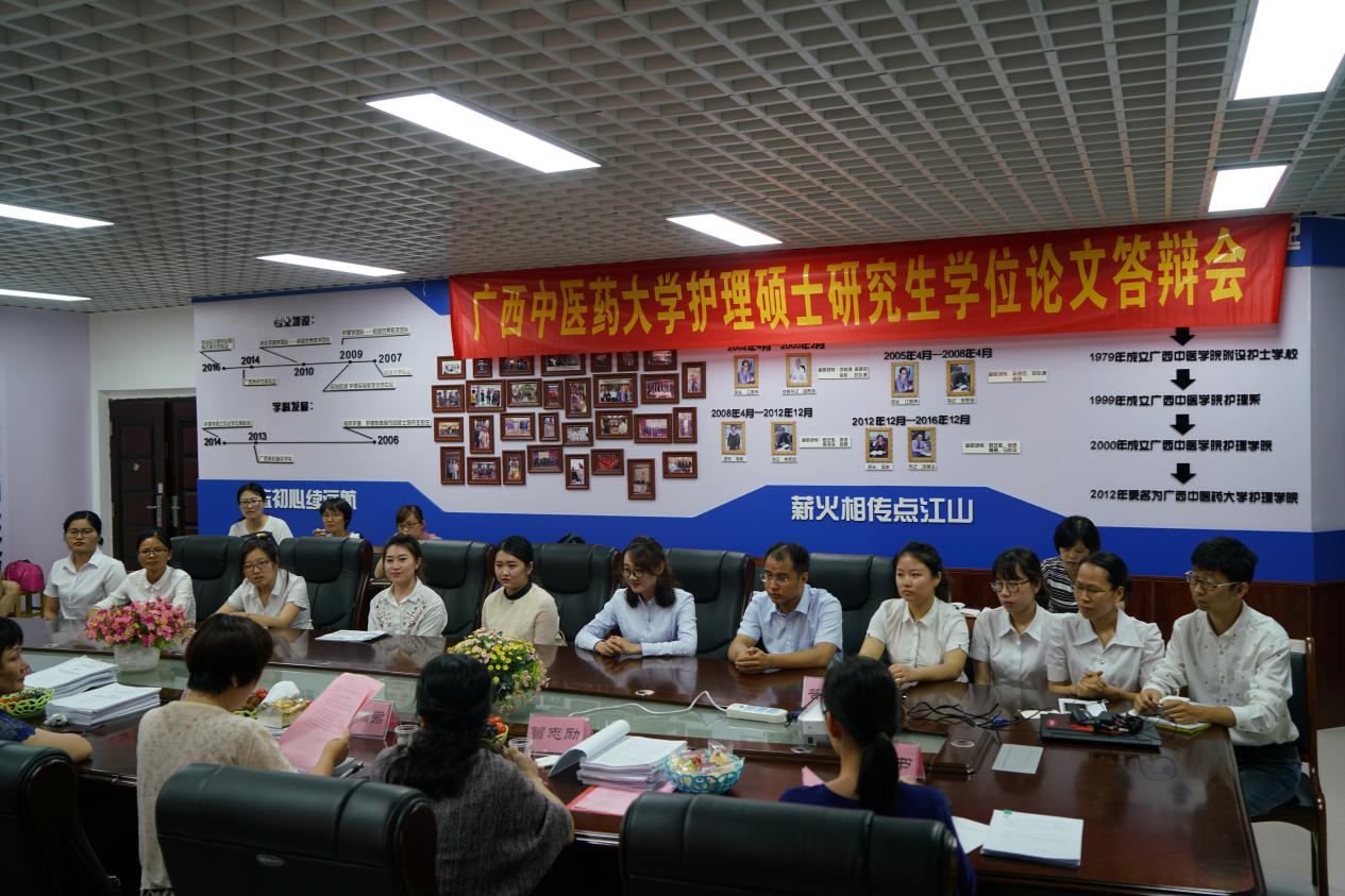 5月25日,星空彩票老版本下载护理学院2018届护理硕士专业学位研究生毕业论文答辩会在学院会议室顺利举行。广西医科大学附属肿瘤医院陈丽君主任护师担任答辩会主席,自治区人民医院傅桂芬主任护师、广西医科大学曾志励教授、星空彩票老版本下载刘燕平教授、星空彩票老版本下载附属瑞康医院龙秀红主任等4位导师担任答辩委员,学院院长、党委书记吴彬主持答辩会,陈玲担任答辩秘书。2018届10位护理硕士专业学位研究生进行了毕业论文答辩。研究生导师、全体在校护护理硕士专业学位研究生、本科生代表参加了答辩会。