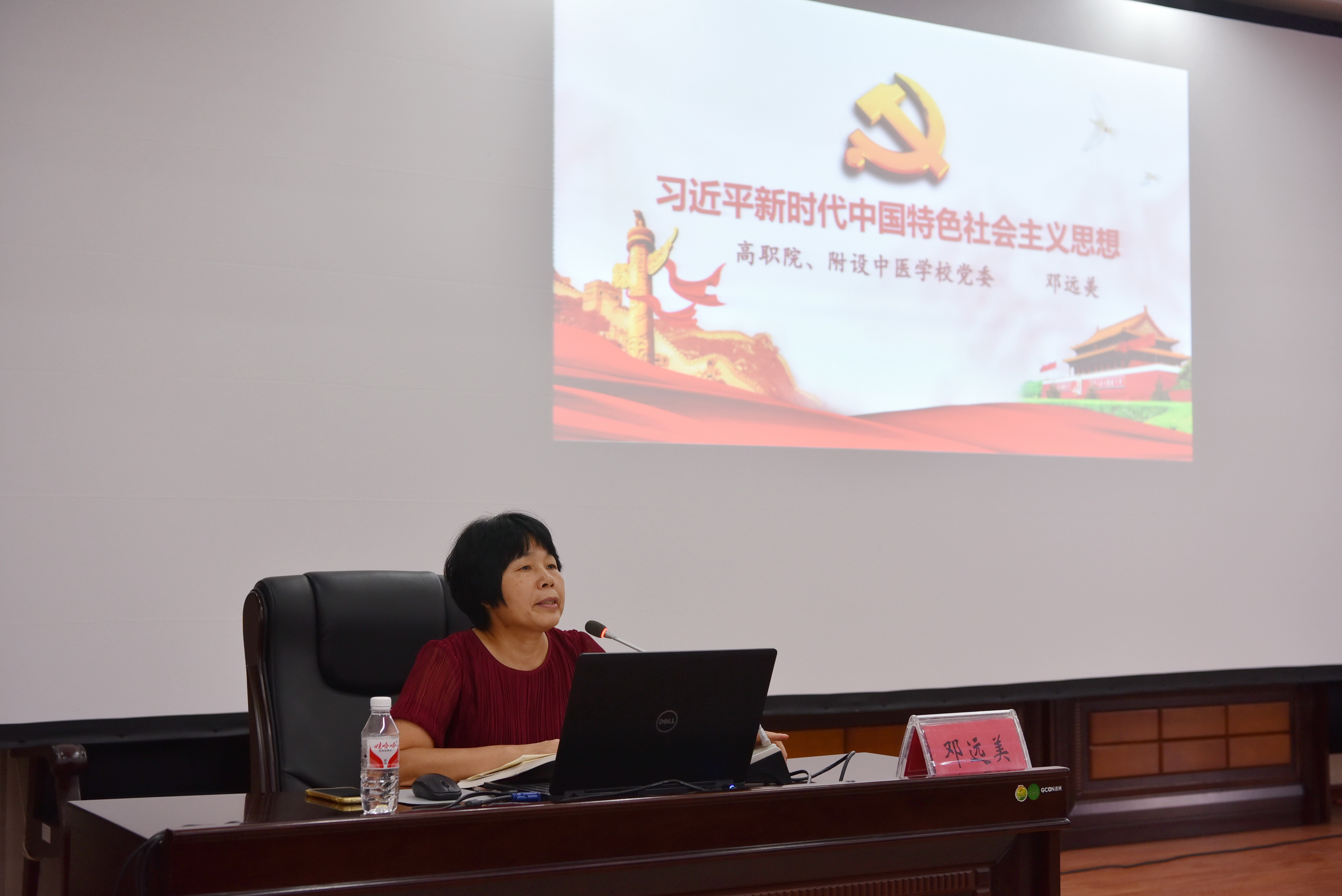 此次培训班共有两个环节,分别是专题党课(第一讲)和主题党日活动。第一环节由高等职业技术学院、附设中医学校党委书记邓远美进行授课,主要解读了习近平新时代中国特色社会主义思想主要内容和基本方略。第二环节主题党日活动为观看爱国电影《厉害了!我的国》,通过观看影片的形式,创新学习载体平台,全方位了解党的十八大以来中国的发展和成就,以及十九大报告中习近平总书记提出的中国特色社会主义进入新时代这一重大论述。