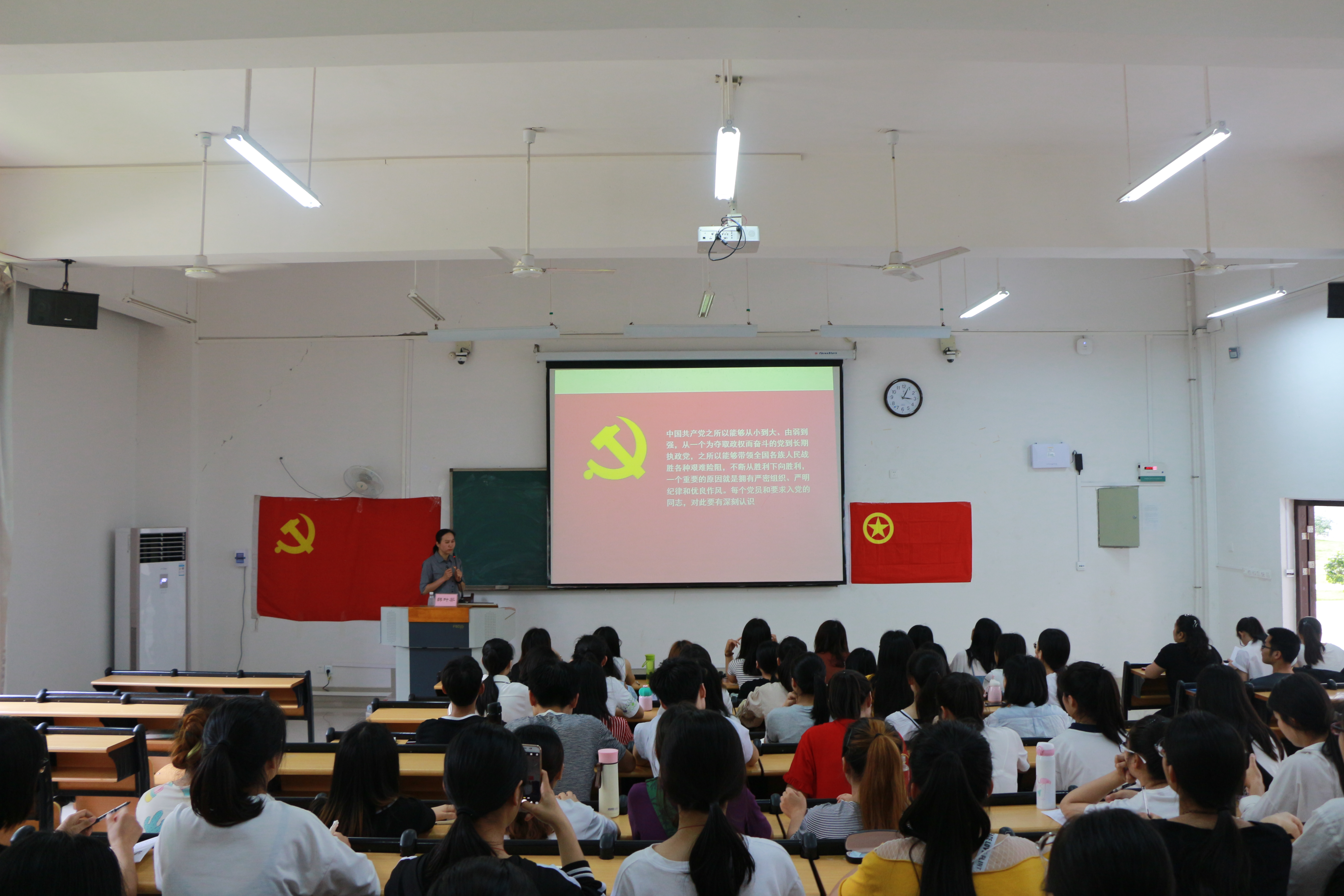 七位老师结合当代中国发展,带领同学们学习党史党情,领会党的精神实质和丰富内涵、共产党员的要求等,如唐振宇结合“十九大以及新党章”内容,强调十九大精神为中国未来的发展指明方向,望青年们牢记时代使命,发挥先锋模范作用。李月发就“廉政”一词引导积极分子树立正确的人生观、价值观,共同为实现共产主义而奋斗。冼锦华带领大家深入学习两会精神,志存高远。吴彬则系统而详实地向入党积极分子讲解了“中国共产党的最终目标和现阶段任务”,增强同学们作为入党积极分子的责任感和使命感,鞭策同学们以实际行动争取早日入党。韩叶芬带领同学们学习党的组织纪律,对同学们提出慎独的要求,以党员标准严格要求自己;胡艳宁通过追忆新中国成长的不易,教育同学们以党的指导思想作为学习与生活的行动指南。马秋平回顾党的光辉历史,号召在座积极分子以老一辈革命者为榜样,不断积累学习,早日加入中国共产党。
