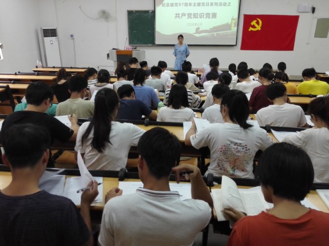 为热烈庆祝中国共产党成立97周年,不断提升党支部建设质量,更好地发挥基层党组织的政治核心作用和党员的先锋模范作用,6月24日晚,公共卫生与管理学院于仙葫校区教学楼2-102教室,组织支部全体学生党员开展了共产党知识竞赛,围绕党章、十九大报告内容、廉洁自律准则等方面进行考查。在考试过程中,大家认真答题,奋笔疾书,严守考风考纪。在平时党支部的培养和各学生党员自我主动学习下,每一位参加此次知识竞赛的党员和预备党员都交上了一份满意的答卷。