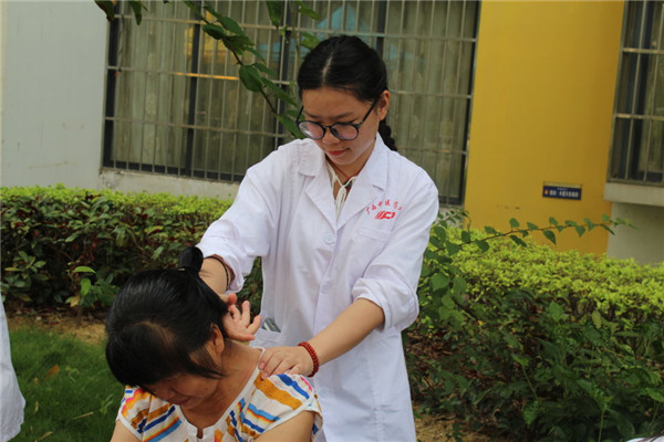 此次义诊活动主要设立了手法组、健康宣传教育组、艾灸组、血压组和药线点灸组,服务对象主要是广西一建衡东苑的居民。义诊活动一开始,各个小组后面就排起了长长的队伍,手法组的同学们细心询问居民情况,接着给他们做了壮医特色手法。而血压组的同学们手法灵活,动作迅速,水银速升速降之下,一次准确的测量已经完成。本次义诊的重点是壮医的特色疗法——壮医药线点灸,药线点灸组的同学们经过细心询问病症,寻找穴位后,利用药线给居民们做治疗,缓解病痛。