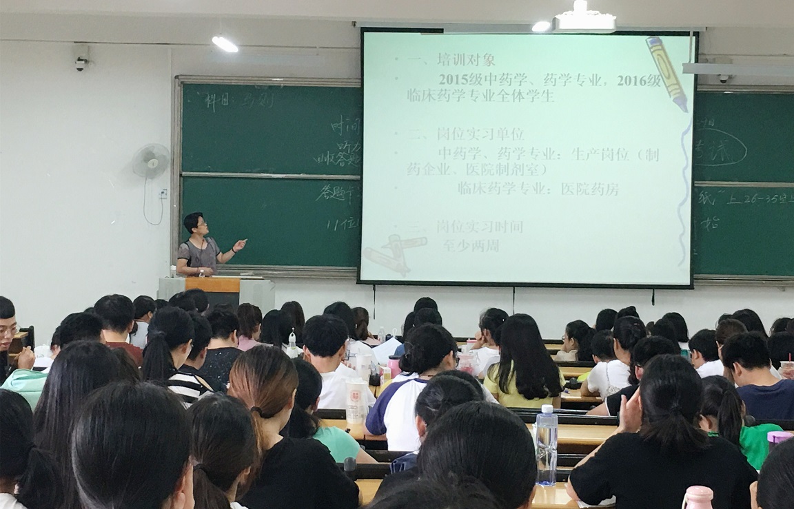 2018年暑假在即,根据人才培养方案的规定,2015级中药学、药学专业暑期须进行为期至少2周的企业岗位实习,2016级临床药学须去医院药房进行见习。为了保证岗位实习与见习工作的顺利开展,7月3日下午,药学院对这批学生进行了岗前培训。主管教学的副院长秦华珍教授、学工办主任凌勇威老师承担了培训工作。376名学生人参加了培训。