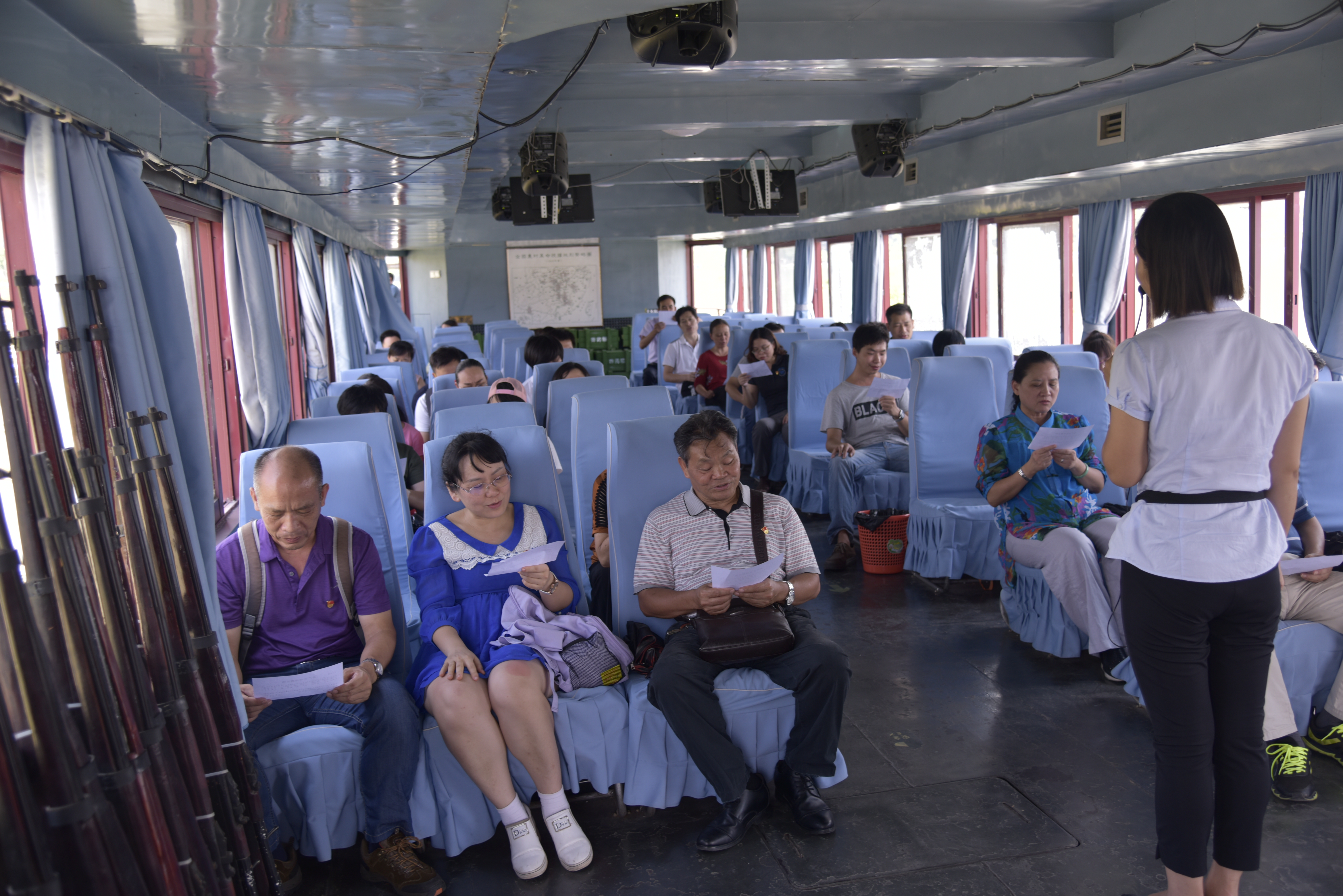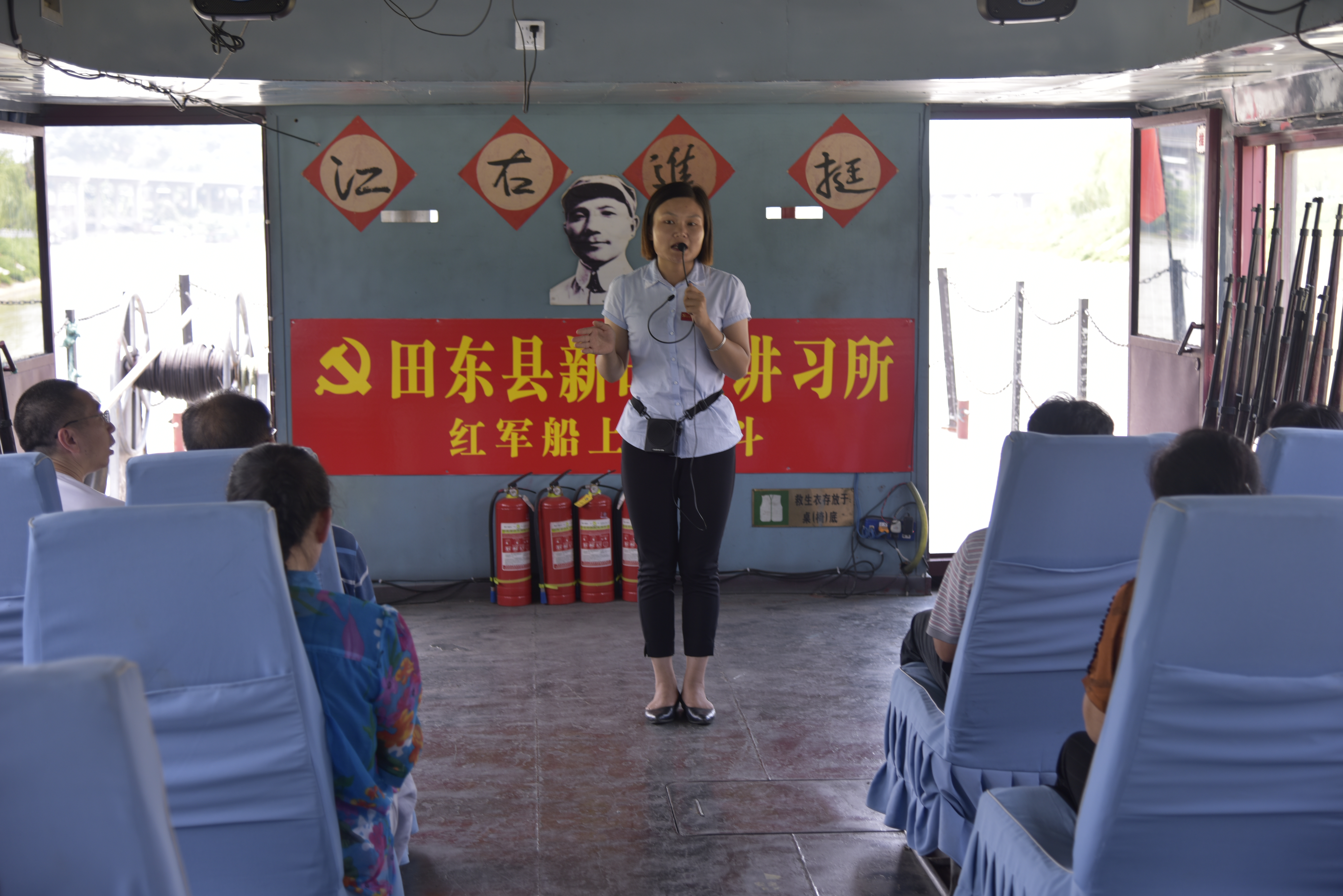 在田东县县委党校老师的专业讲解下,详细了解了那恒农民运动的蓬勃发展历史,以及田东人民参加百色起义、建立苏维埃政府、不屈不挠坚持革命斗争的光辉历程。此后,全体成员沿着当年邓小平同志“挺进右江”的足迹,从那恒码头乘坐“红军号”前往二牙码头。在行船途中,大家听取讲解员关于邓小平同志“挺进右江” 、邓小平同志和张云逸同志在平马胜利会师的历史背景,并观看《百色起义》视频影像片段,还集体学唱红色歌曲《共产党领导真正确》。