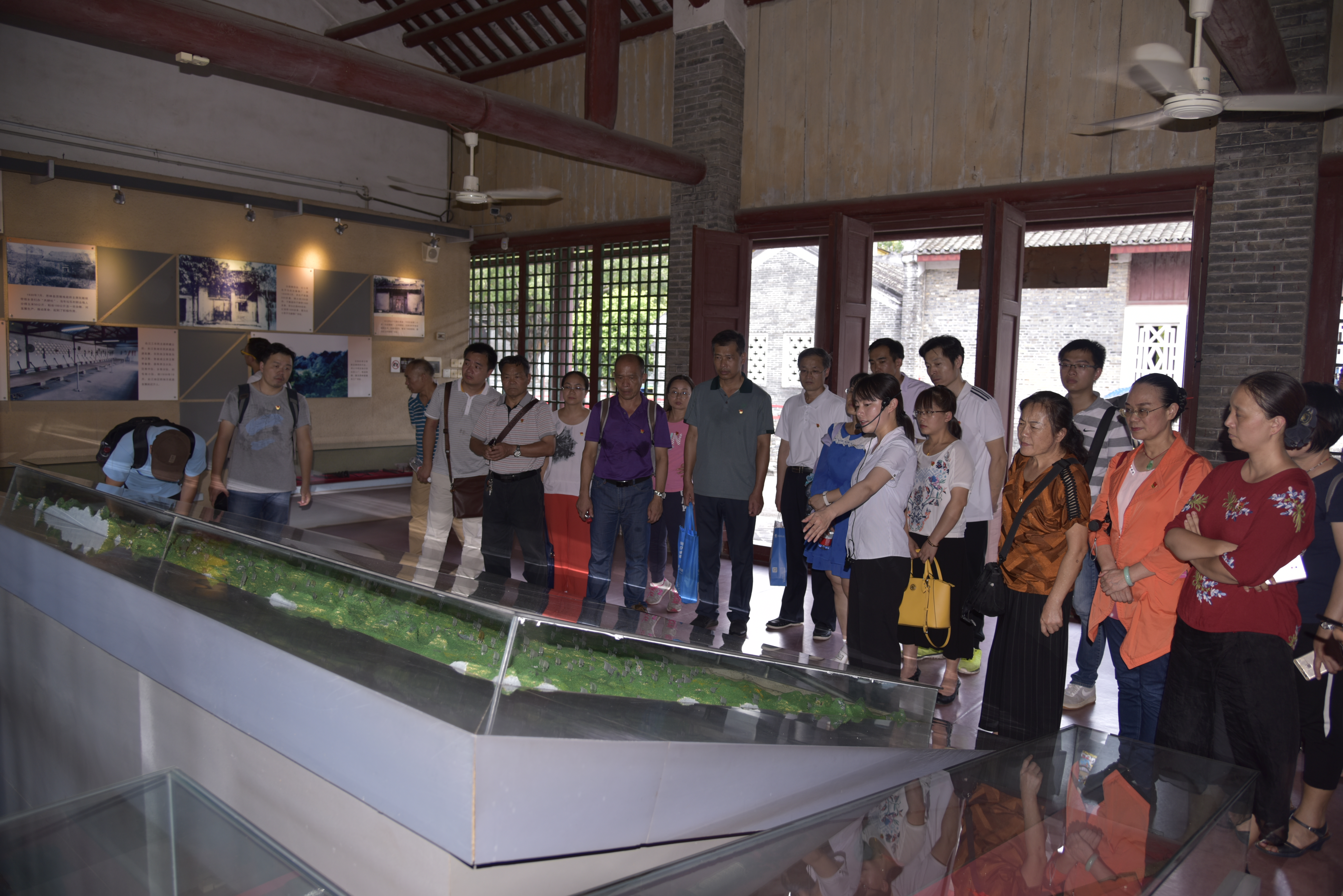 随后,全体成员抵达右江苏维埃政府旧址—经正书院。全体成员认真参观了馆内设有的展品,其中有邓小平同志踏上田东第一步的台阶、邓小平同志下仓圩访贫问苦时送给贫苦农民的棉大衣、起义时所用的枪支弹药等,并通过讲解员的讲解充分了解到著名的“恩隆暴动”的基本情况。最后,此次革命传统教育活动在模拟右江地区第一届工农兵代表大会的情境教学中结束。