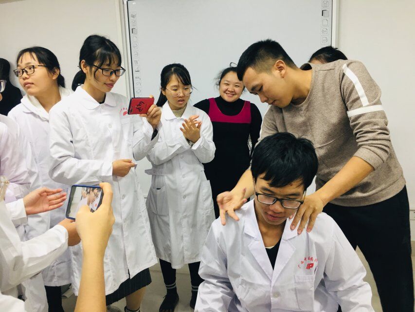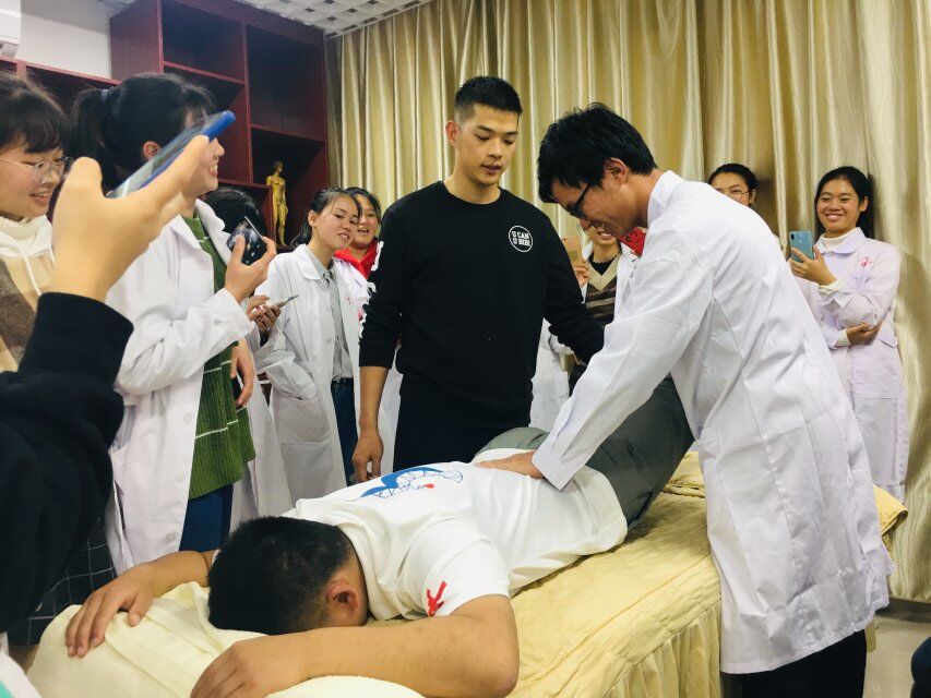 本次实训课的主讲人为我校针推学院四年级学生蒋能春、李培泽两位同学,二位在学校组织的推拿手法比赛中双双荣获一等奖,蒋能春同学曾在“全国中医药院校‘针灸推拿’比赛”中荣获中职组一等奖。两位同学详细解说与实操了按法、捏法、揉法、滚法、拨法等多种推拿基本手法,在治疗颈部、肩部、腰部和腿部等常见病中的手法组合,同学们学习劲头足,互动频繁,加深了同学们对推拿知识与技能的掌握程度。整个培训过程热烈而融洽。