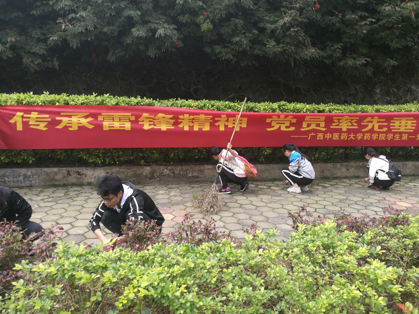 为传承雷锋精神,共建绿色家园, 3月30日,药学院学生第一党支部开展以“传承雷锋精神,党员率先垂范”为主题的学雷锋活动。刘佳老师带领支部二十余名学生党员同志代表走进南宁市烈士陵园,协助园区工作人员开展清洁除草、美化环境的公益活动。