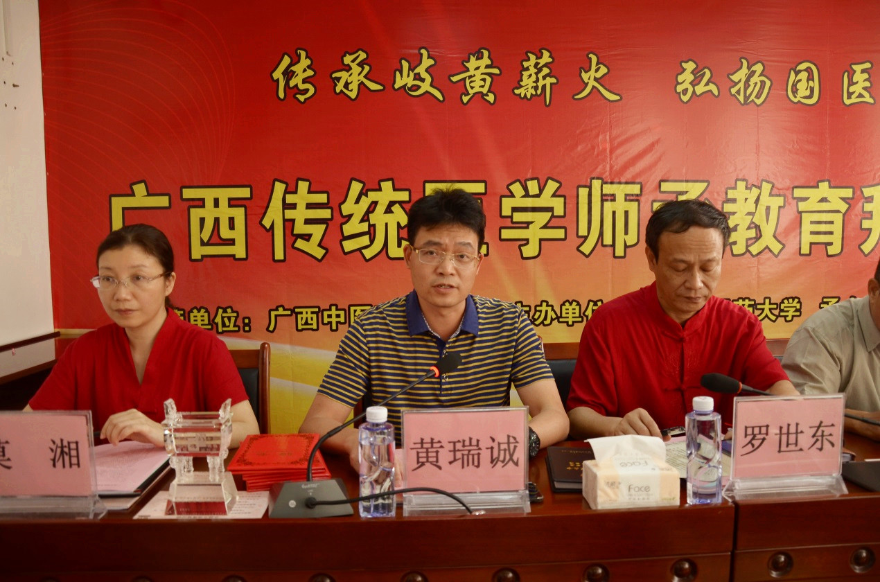 拜师仪式前的会议由黄瑞诚副院长主持。李论代表梧州市中医药管理局向与会的指导老师和师承人员表示热烈的祝贺。他指出,此次在梧州中医医院开展传统医学师承教育是梧州市中医药发展的重要举措,是发展梧州中医药人才的好机会。希望各位老师能对学生严格要求,也殷切期望各位学员能虚心求教、开拓创新,做优秀的中医传承人。韦艾凌指出:中医学是一门实践性很强的科学,以经验医学著称,没有广泛的临床、没有名师的指点,很难体会到个中的深奥微妙。希望学员们要尊敬老师,勤奋学习,善于思考,只有这样,才能融汇贯通,成为一名合格的、优秀的中医人才。