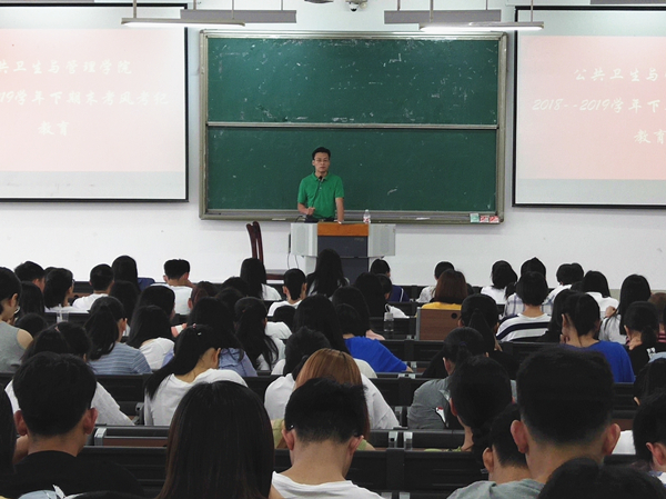 公共卫生与管理学院 开展期末考风考纪教育 来源:公管学院 作者:学办 日期:2019-06-25 点击数: 次 分享到: 期末将至,为增强学生诚信考试意识,加强我院学风建设,6月23日下午,公管学院在1-201召开了期末考风考纪教育大会。本次大会由学院学工办工作办公室主任宋南主持开展,学院全体学生参加了大会。会上,宋南着重强调了同学们一定要做好期末复习准备,自觉遵守考场纪律、坚决杜绝各种考试舞弊行为,重申了考试作弊的处分规定,并要求考试期间务必带齐学生证和准考证。 会议现场 打印正文 关闭本页