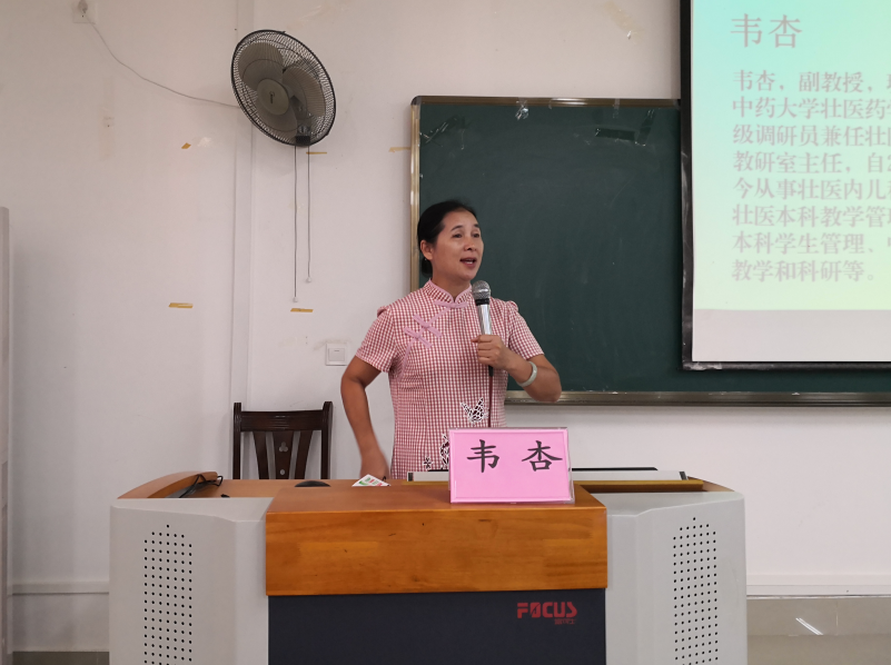韦杏详细介绍了壮医药学院的优秀教师团队。韦杏希望同学们能够遵守学校相关规定,在德、智、体、美、劳这五个方面锻炼自己,成为优秀的壮医学人才。