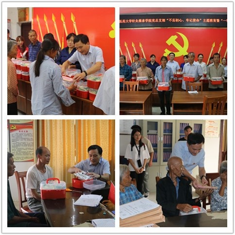 蒋林同志先是给贫困户上了一节简短生动的感恩教育课,与贫困户分享扶贫工作开展以来的心得。接着,药学院党员为32户扶贫户送上了健康药箱以及慰问金,并与贫困户亲切交谈,为他们讲解健康药箱里药品的作用。慰问结束后开展义诊活动。义诊现场人潮涌动,不少村民慕名而来,群众有序排队,专家依次接诊。专家们一边认真倾听就诊群众的陈述,了解病情,询问细节,耐心解答他们提出的各种疑问,让他们享受到专家们的优质医疗服务,也感受到了温馨的关怀。开展此次义诊活动,进一步坚定了党员同志“为人民健康服务”的理想信念,是药学院党委“不忘初心、牢记使命”主题教育的具体行动,对实施“健康中国”战略和建设美丽广西具有积极地促进作用。