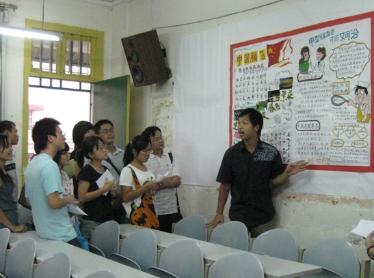10月12号下午,第一临床医学院团总支、学生会举办“与祖国共喜庆,与健康共前行”为主题的海报评比活动,评委由第一临床医学院教学党总支专职副书记覃国智老师,教学部、学工部副主任林强老师,广西中医学院第一附属医院团委副书记肖易老师,团委李杭老师,年级主任秦燕老师以及团总支、学生会部分委员和各班级宣传委员共同组成。老师们在学生会及各班代表的陪同下,对各班级的海报逐一进行了评分、计分和点评。各班级团结一致设计迎评海报,发挥了最好水平。教室内洋溢着同学们的青春,海报上写满了同学们对祖国的热爱和抗击甲流的决心。最终06针推班摘得桂冠,06传统班荣获最佳创意奖。