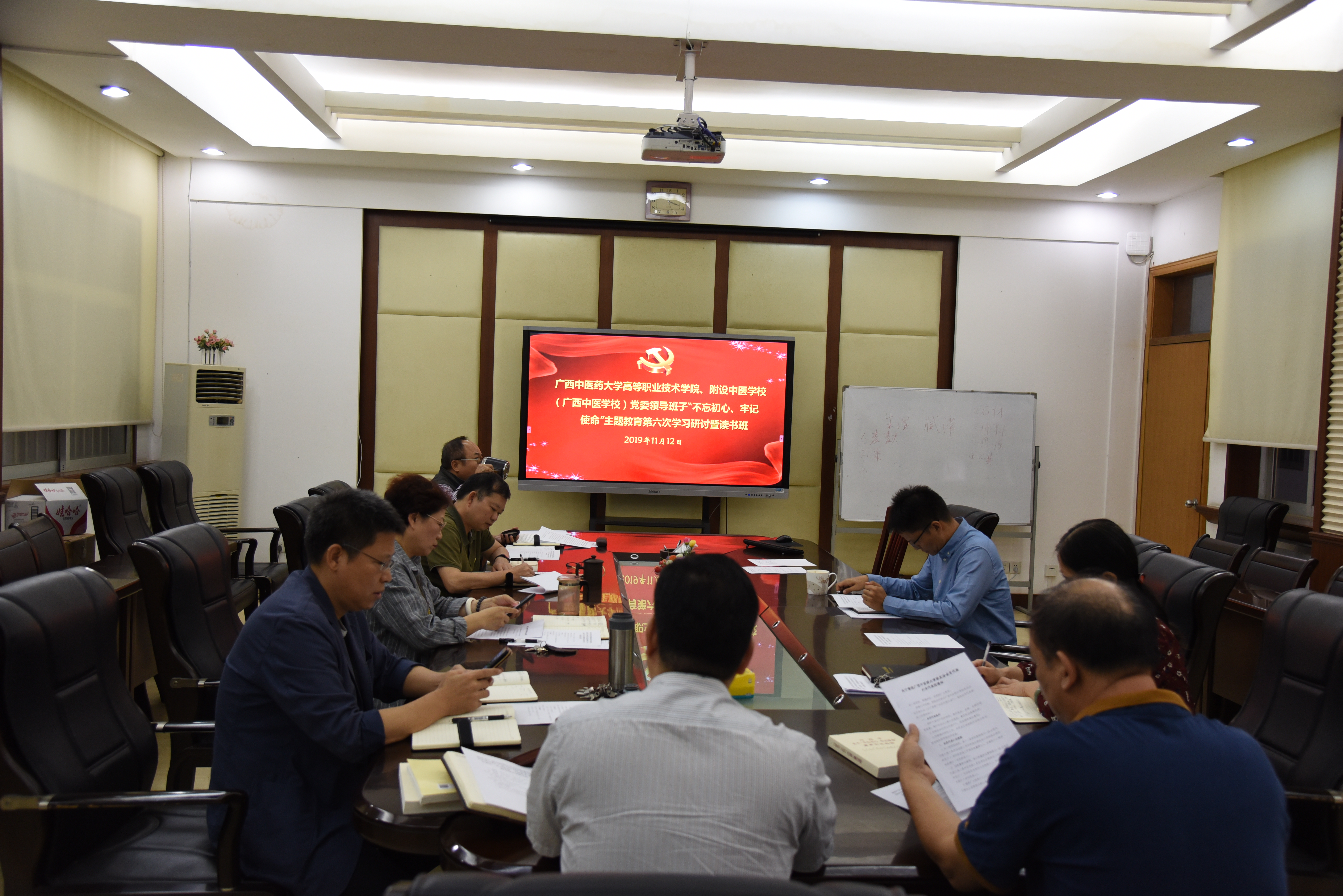11月12日上午,高职院、附设中医学校“不忘初心、牢记使命”主题教育第六次专题学习研讨暨读书班在东葛校区一楼会议室举行。