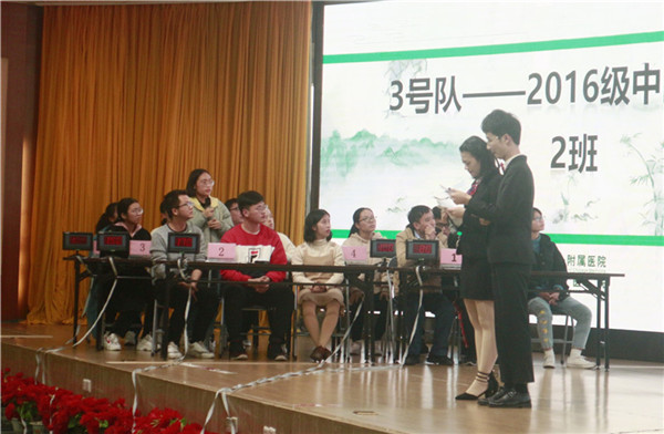 本次竞赛采用现场竞赛,现场评分,现场公布比分的方式进行,分为个人必答题环节和小组抢答环节。比赛现场精彩绝伦,抢答环节更是热火朝天,各参赛队伍的分数你追我赶,不相上下。同时大赛上还设置了观众互动抢答环节,台下的同学们积极抢答,现场气氛活跃。经过激烈的角逐,2017级中医学(免费医学定向)二班以211.44的总分获得本次临床能力技能大赛的第一名。