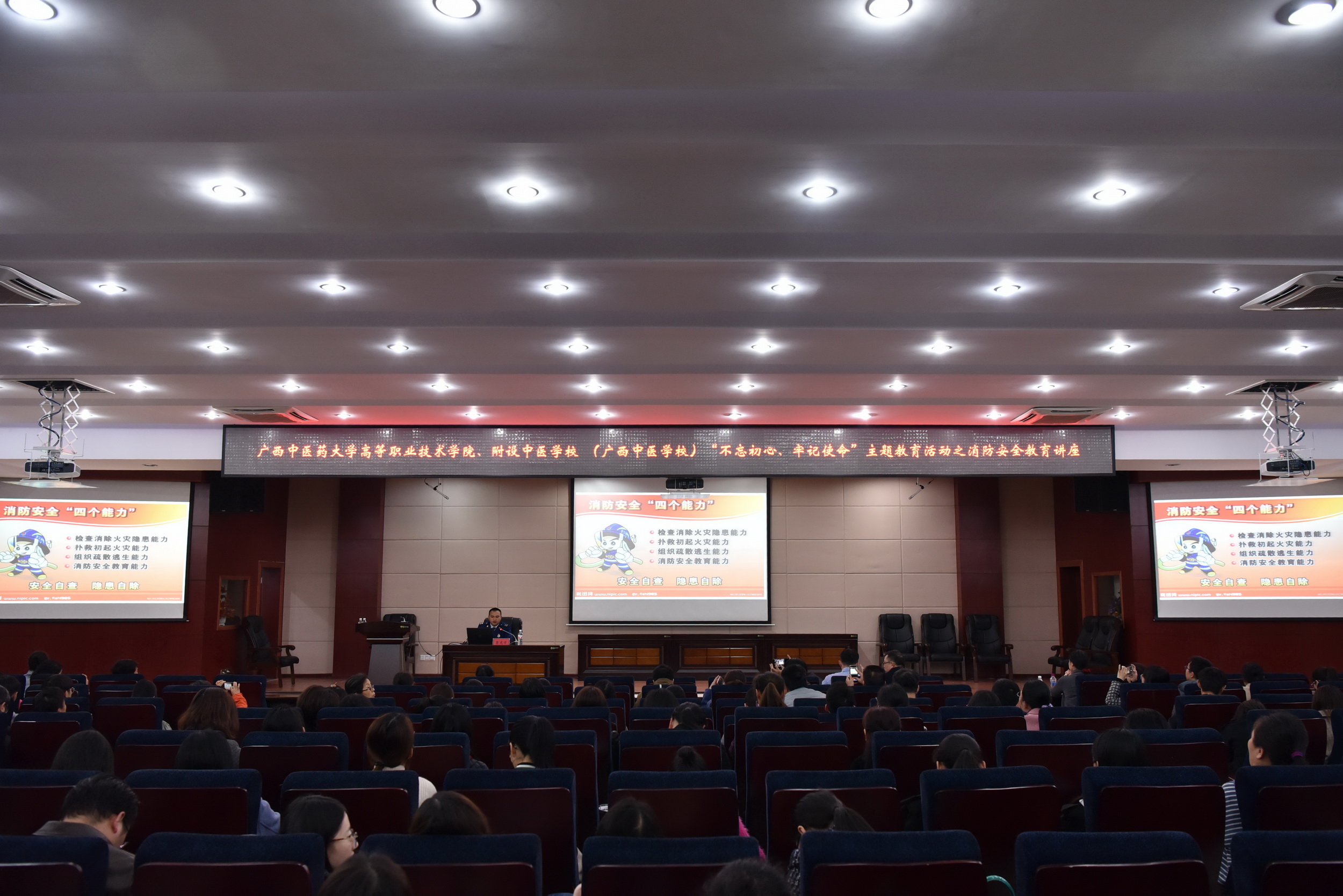 12月10日,高职院、附设中医学校在北湖校区开展“不忘初心、牢记使命”消防安全知识讲座暨消防技能演练。邀请了北湖消防中队的中队长助理陆龙首警官进行消防知识专题培训讲座。高职院、附设中医学校全体教职工,康体保健中心、重阳老年公寓、重阳城幼儿园、食堂、物业等员工及学生代表共计240余人参加本次讲座。