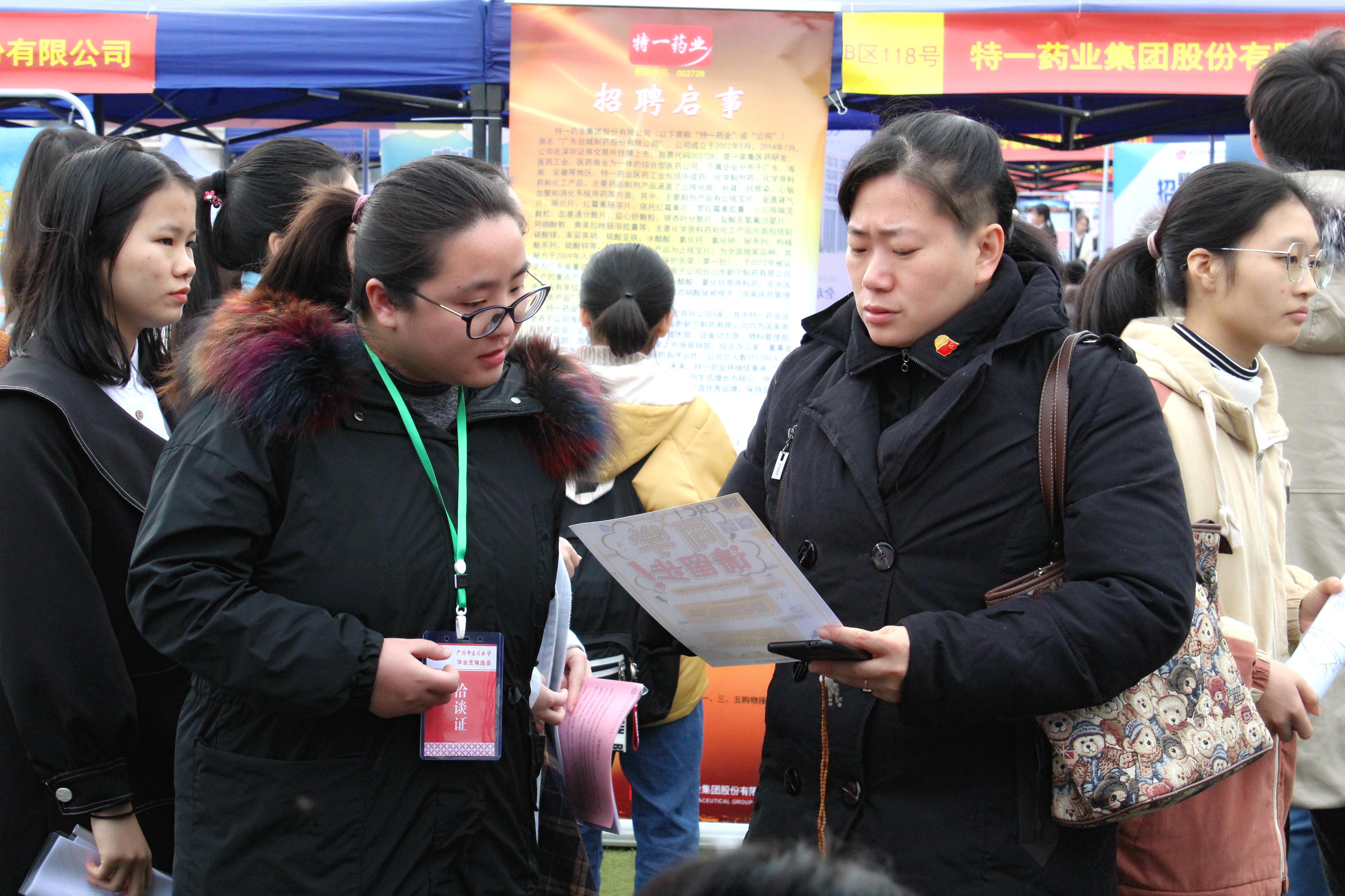 12月23日,药学院组织520名毕业生参加我校仙葫校区承办的广西高校中医药类毕业生就业“双选会”活动。药学院蒋林、李豫萍、凌勇威、孙慧玲、吴玉峰等十余名领导、老师及毕业班辅导员、班主任在会场中忙碌穿梭为毕业生们开展就业推荐。当日,药学院中药学、药学、食品类等专业30多名毕业生在“双选会”上现场与用人单位签订了就业协议书,200余名毕业生与用人单位达成了就业意向。