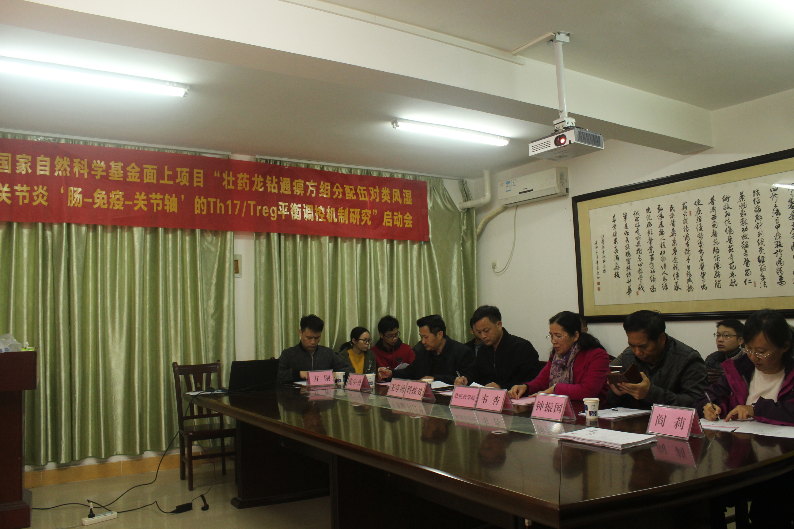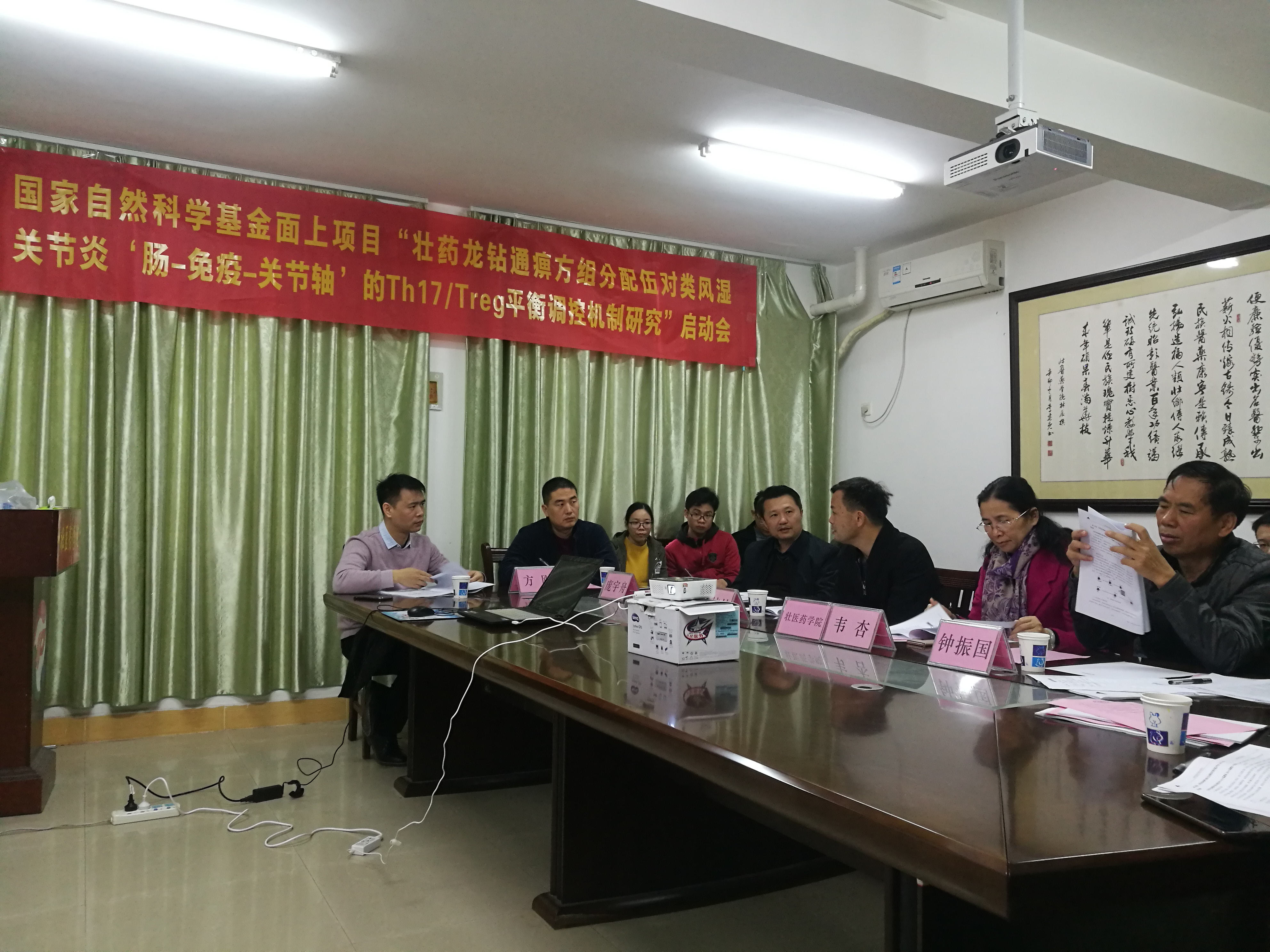 1月15号上午,壮医药学院在明秀校区会议室举行2019年国家自然科学基金项目“壮药龙钻通痹方组分配伍对类风湿关节炎‘肠-免疫-关节轴’的Th17/Treg平衡调控机制研究”启动会。