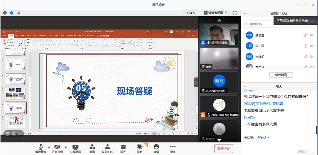 9月20日晚,药学院2020级药学、食品质量与安全专业160余名新同学通过腾讯会议视频与辅导员、班主任助理见面。会议由辅导员吴玉峰老师主持。