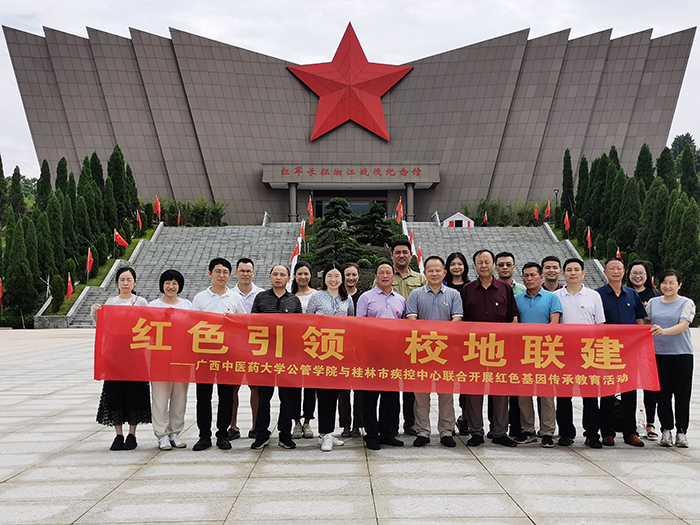 公共卫生与管理学院书记李怀泽、院长董柏青带领全体领导班子、各党支部书记一行16人,与桂林市疾病预防控制系统的同志们一道学习参观了全州县红军长征湘江战役纪念园、灌阳县湘江战役新圩阻击战酒海井红军纪念园、兴安县湘江战役光华铺阻击战旧址。在聆听革命故事、传承红色基因的同时,进行了深入的沟通与交流。