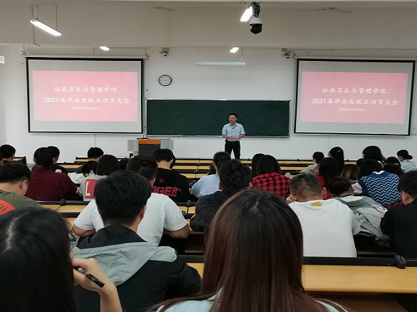 10月22日下午,公共卫生与管理学院在教学楼1-107召开2021届毕业生就业动员大会,公共卫生与管理学院2021全体届毕业生以及团委书记鲁蕴律参与本次会议,会议由学生工作办公室主任宋南主讲。