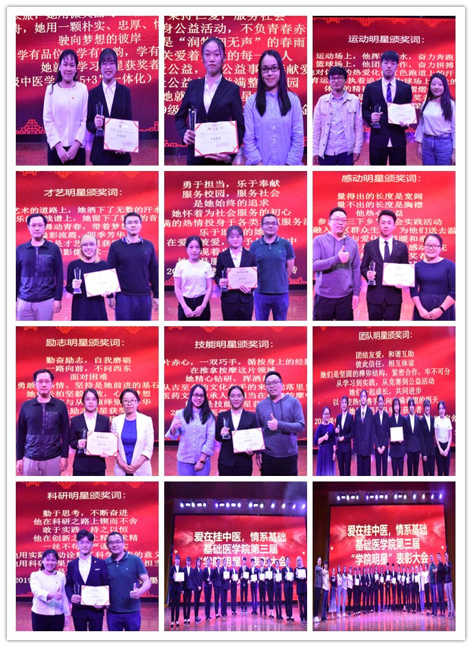 本届基础医学院评出了“学习明星”、“服务明星”“公益明星”“科研明星”“励志明星”“感动明星”“才艺明星”“运动明星”“技能明星”“团队明星”。