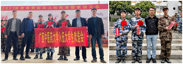 3月15日上午,药学院5名学子分别在青秀区、西乡塘区参加2021年春季新兵入伍批准暨欢送大会,他们身着戎装,胸戴红花,整装待发,即将踏上军旅征程,履行保家卫国的神圣使命。