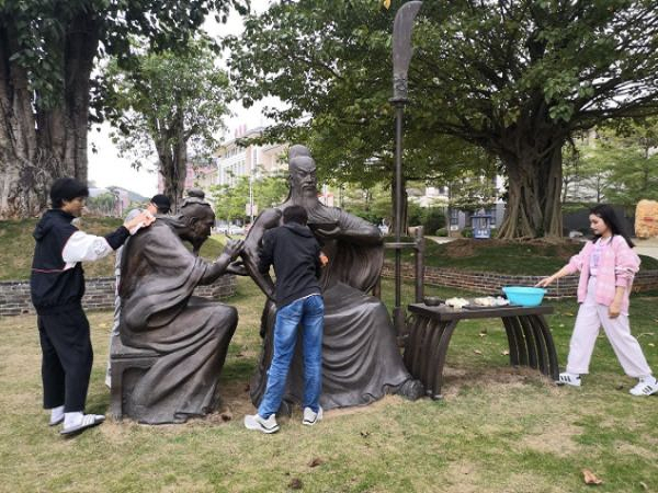 2019级信息管理与信息系统班同学在擦拭校园塑像