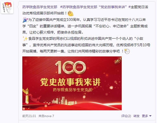 为迎接中国共产党成立100周年,深入贯彻落实习近平总书记在党史学习教育动员大会上的讲话精神,2021年4月-5月,食品学生党支部开展“党史故事我来讲”主题党日活动,支部党员、入党积极分子积极参加此次活动。