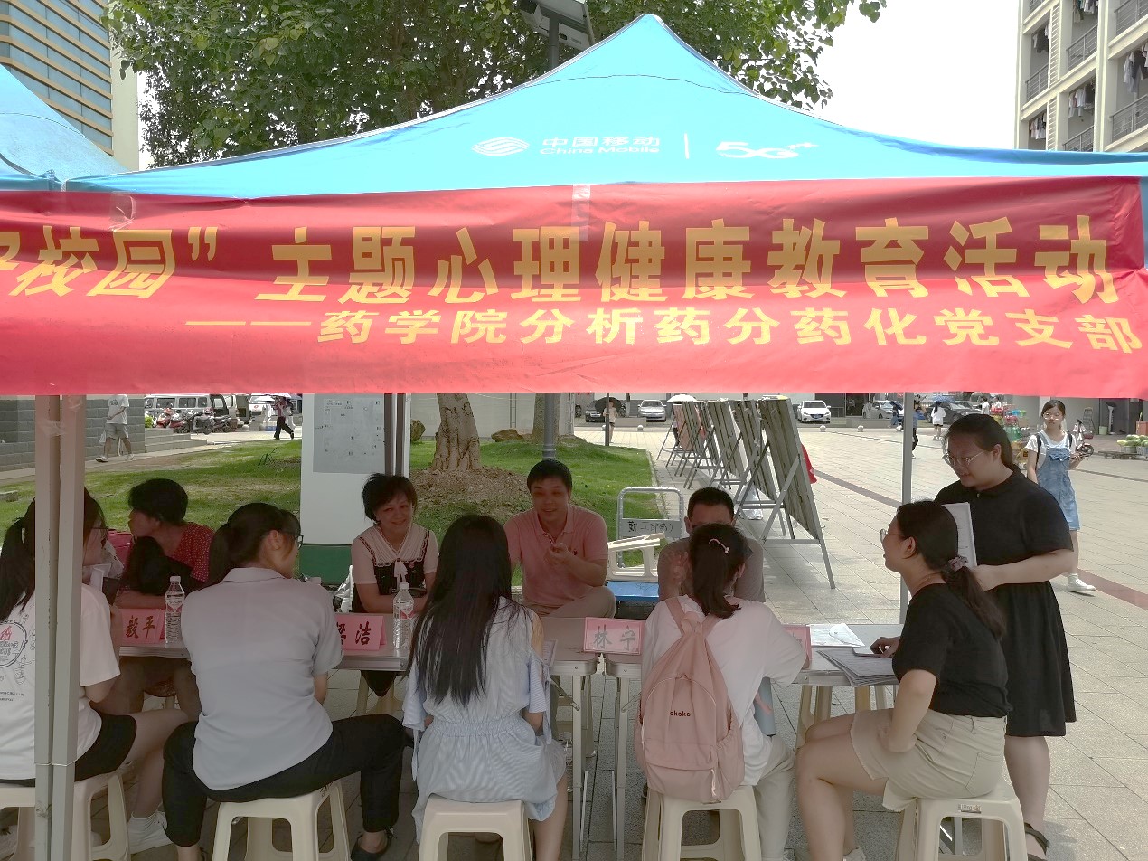 近年来,大学生心理健康问题引起了社会、学校、家庭的广泛关注和思考,关注大学生心理健康很有必要。基于此,药学院分析药分药化党支部于2020年6月1日中午,在仙葫校区食堂门口,开展党史学习教育“我为群众办实事”实践活动——“关爱心理健康、共享美好校园”主题心理健康宣传活动,面向大学生宣传心理健康知识、提供现场咨询,引导大学生关注自身心理健康。