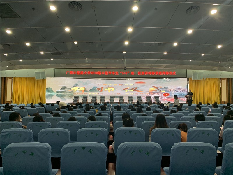7月14日下午,第一临床医学院2018级中医学(“5+3”一体化班)、2018级中医学(桂派杏林师承班)拜师仪式在第一临床医学院东葛院区住院大楼五楼多功能学术厅隆重举行。学校教务处处长莫雪妮、第一临床医学院院长谢胜、第一临床医学院党委副书记、副院长钟远鸣、学生导师、教学部老师及2018级中医学(“5+3”一体化班)、2018级中医学(桂派杏林师承班)的96位同学参加了拜师仪式。拜师仪式由第一临床医学院教学部黄彬主任主持。