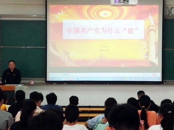 会上,李怀泽通过引用习近平总书记重要讲话、回顾中国近代史、作为一名老党员的自身感受,阐述了中国共产党的产生是历史的必然产物。随后,李怀泽围绕党课主题从“中国共产党自身的先进性”、“中国共产党没有自己的特殊利益,始终把人民利益摆在最高位置”、“中国共产党始终保持自我革命精神,具有极强的自我修复能力”展开了讲授,强调了中国共产党始终把人民利益放在第一位的执政理念。接着,李怀泽与同学们共同欣赏了红歌《信仰》,并提出学史可以增信、学史令人崇德的观点。