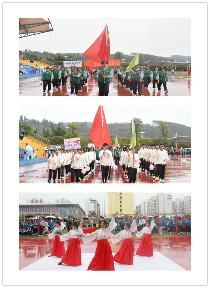 伴随着隆重入场进行曲,国旗队、院旗与校训牌匾方块队踏着坚定的步伐庄严入场,他们双眸有神、身躯挺拔,展现了我院学子朝气蓬勃的精神风貌;随后,裁判员、工作人员方块队、班级方块队喊着响亮的口号有序入场,他们灿烂的笑容、轻盈整齐的步伐,体现了当代大学生的青春与活力。入场仪式结束,全体肃立,面向国旗、校旗,举行了隆重的升国旗、唱国歌和升校旗仪式,伴随着高亢嘹亮的《义勇军进行曲》,全体师生高唱国歌,歌声响彻校园,让人备感振奋。接着,党委副书记龙春莉致开幕词,希望全体同学积极发扬“团结协作、顽强拼搏”体育精神,锻炼良好身体素质,磨练坚强意志品质,努力学习,更好投身伟大医学事业。