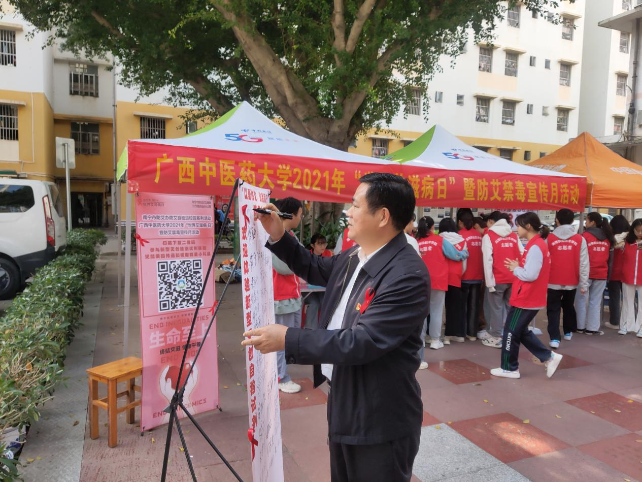 在活动现场志愿者们通过防艾签名、防艾知识宣传展板、宣传横幅、发放宣传资料等开展艾滋病预防教育宣传,对现场参与的学生讲解艾滋病相关知识、传播途径、如何预防艾滋病等,并提供咨询和检测试剂,倡导关爱不歧视HIV感染者。明秀校区1200多名学生通过防艾宣传签名等形式参与此次活动,共发放预防艾滋病宣传材料1500份。