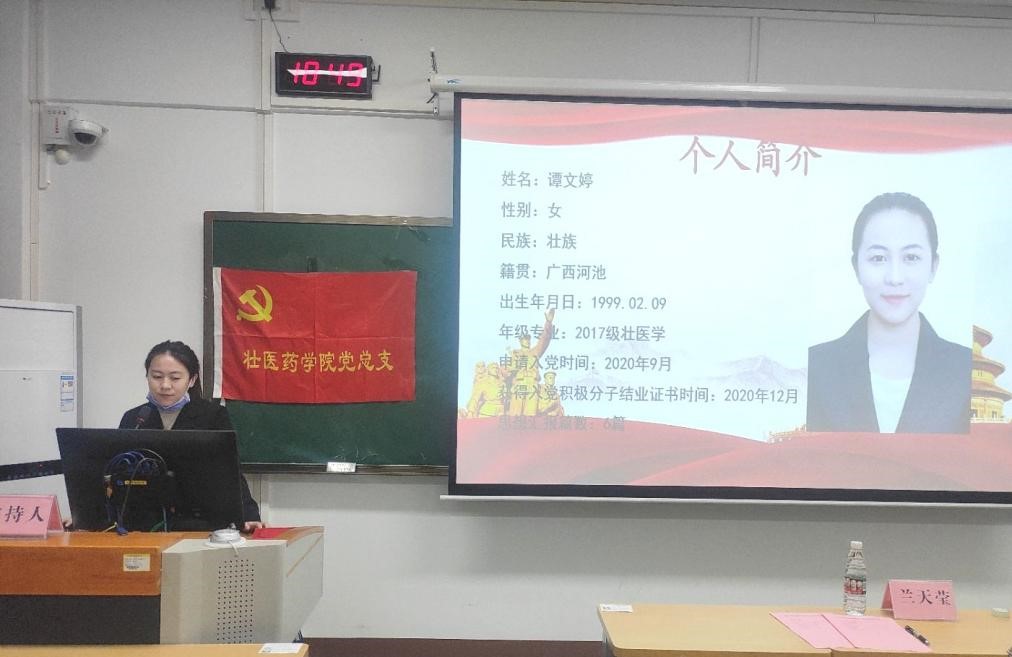 为做好发展党员工作,进一步加强党员队伍建设。壮医药学院学工党支部发展大会于11月28日晚在明秀校区时珍楼606教室召开。壮医药学院学工党支部书记兰天莹、壮医药学院学工党支部全体学生党员参加本次会议。