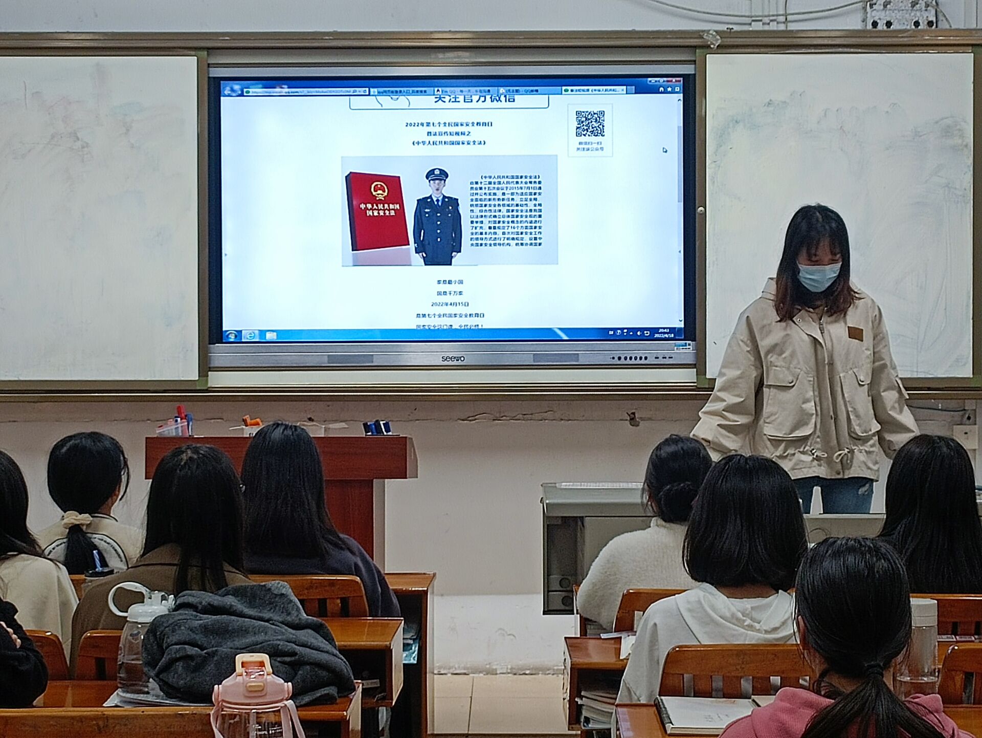 4月18日高职院、附设中医学校学生第二党支部运用“线上+线下”同步宣传的方式,开展了丰富多样的宣传活动。线上,灵活运用学习微信、QQ工作群等网络工具实时推送国家安全知识,如观看“国安宣工作室”发布的海报、观看普法宣传短视频等方式,扩大了宣传覆盖面,提高了师生的知晓率,让“维护国家安全、捍卫国家利益”成为全校的思想和行动自觉。线下,支委会成员召开班会课,向同学们普及国家安全法的内涵以及公民、组织在维护国家安全方面的义务和权利等相关知识。此外,还与同学们共同学习人民日报刊发的刘宁通知署名文章。
