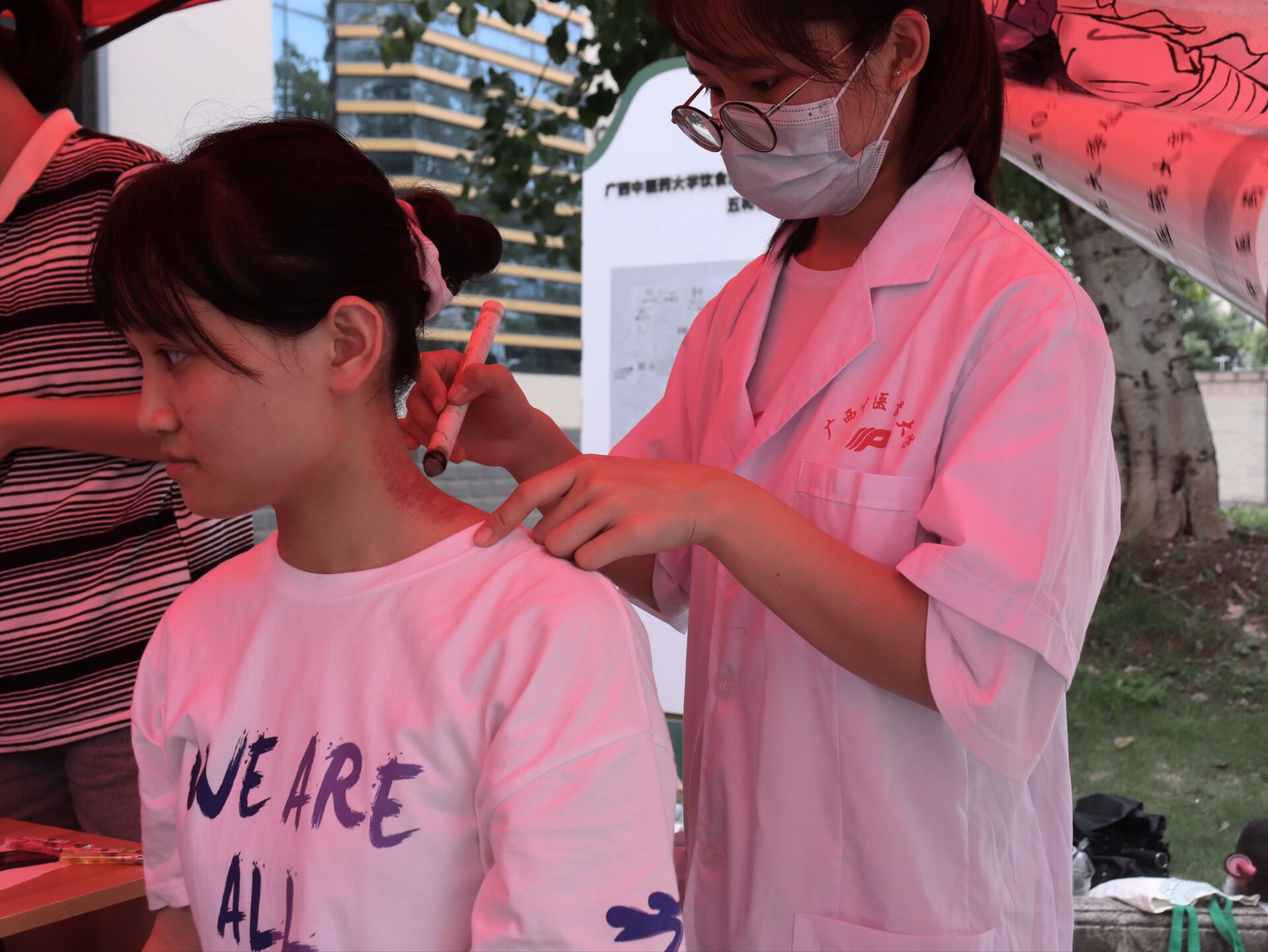 本次活动包含了艾灸、推拿、量血压、刮痧,针刺等中医特色理疗服务。活动期间,志愿者们灵活地运用自身所学知识为前来体验的同学进行了相应的理疗服务。量血压组的志愿者们提供了测量血压服务并耐心细致地向前来体验的同学们和阿姨讲解血压的有关知识;推拿组的志愿者们提供了肩颈部和背部的手法按摩服务,有效地缓解了体验者的疲劳;艾灸组的志愿者们提供了艾灸和针刺服务,针和灸的完美结合突出了针推专业的特色;刮痧组的志愿者们则为体验者提供了颈部的刮痧服务,改善了局部的血液循环。活动过程中,志愿者们各司其职,认真负责,和蔼亲切,一举一动皆展示了针推学子的风采。
